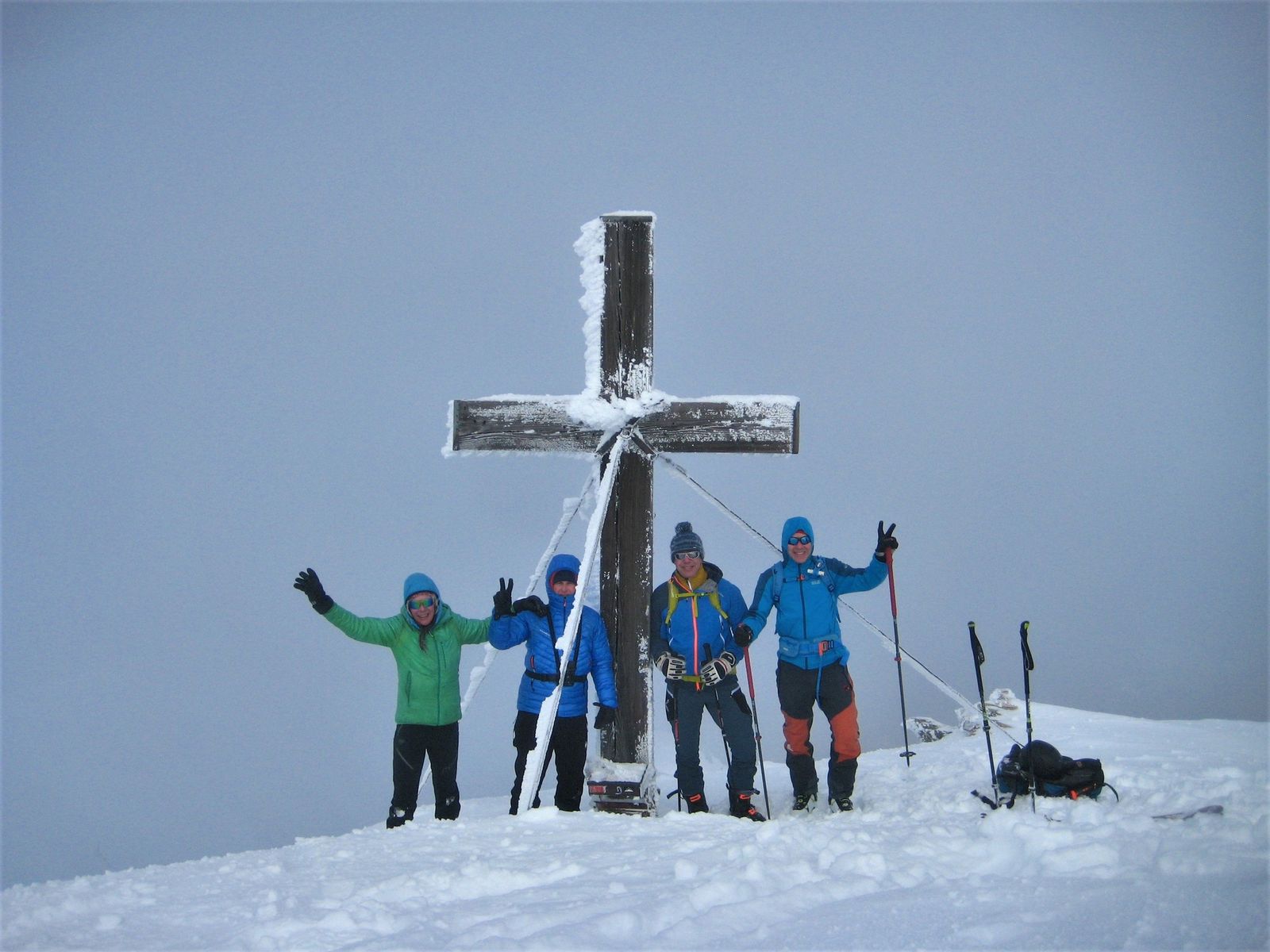 Wir starteten an der Kaiserbahn bei gar nicht so kaiserlichem Wetter: Die Sonne machte sich morgens noch etwas rar. Von der Bergstation aus zogen wir unsere Spur hinauf zum Pirchkogel als erstem Etappenziel. Zwischendurch gab*s einen Blick durch die Wolkenfetzen hinüber zum Finstertaler Speichersee, am Gipfelkreuz indes hüllte uns erstmal der Nebel ein.