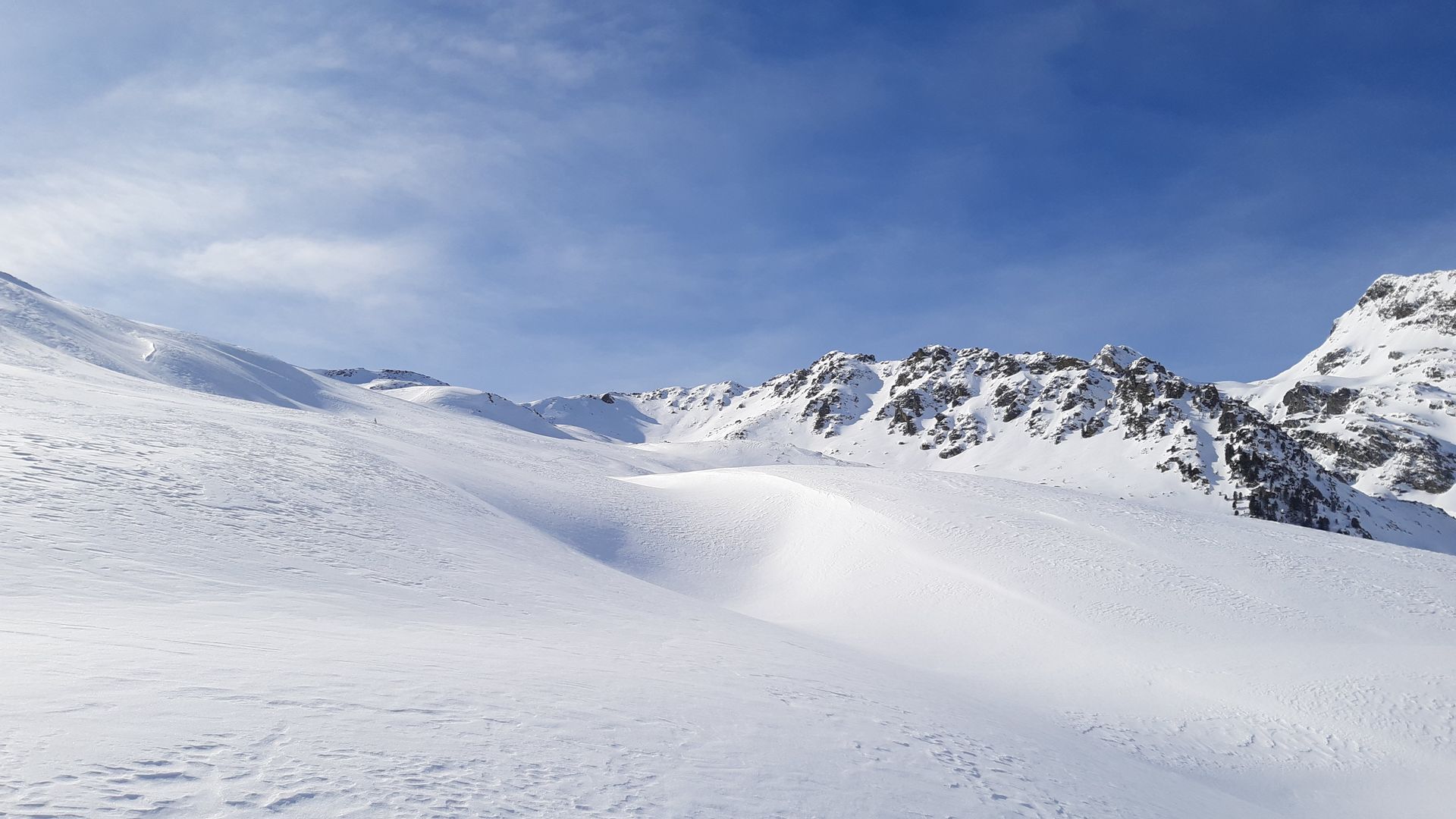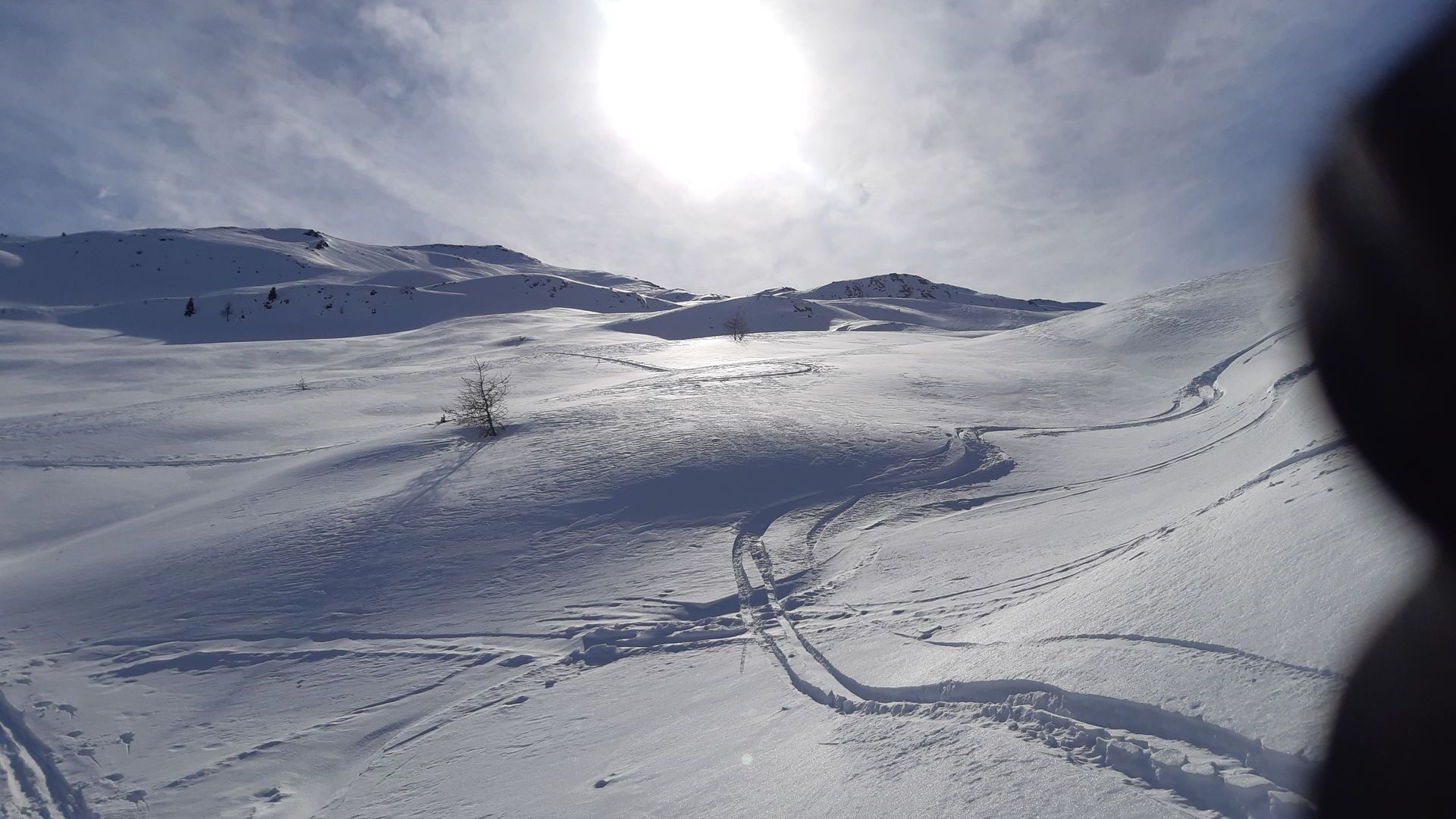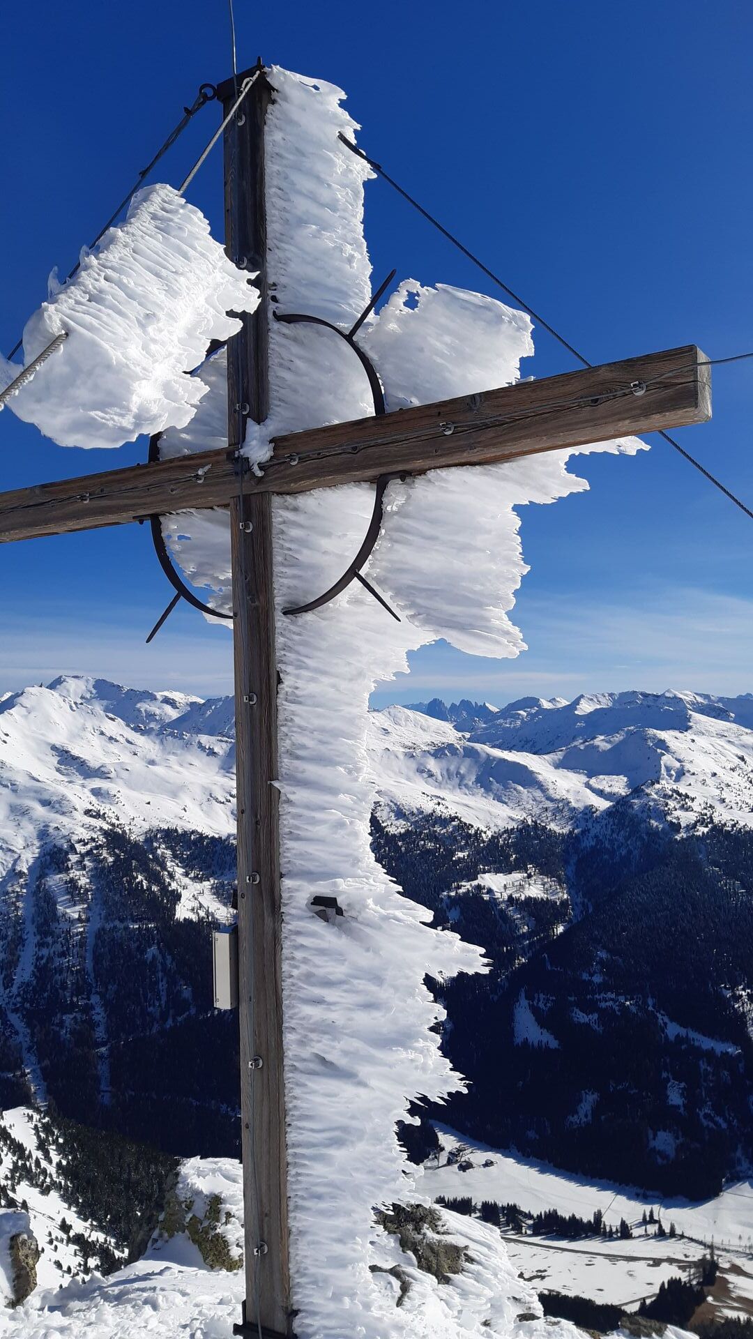 Ausgangspunkt Wintersperre der Passstraße 1580m. Nach 5 Minuten begehbar. Hatsch auf der Straße um den Berg. Aufstieg nördlich durch einen Waldgürtel mit reichlich Powder mit Spur, aber sonst keiner unterwegs. Danach schöner freier Hang zum breiten Kamm. Zum Gipfelkreuz kurz zu Fuß. Abfahrt vom Kamm sehr steil oder kommod. Erst Press- und Triebschnee, weiter unten pulvrig. Am schönsten: steile Waldschneisen mit viel Fluffipowder. ![]()