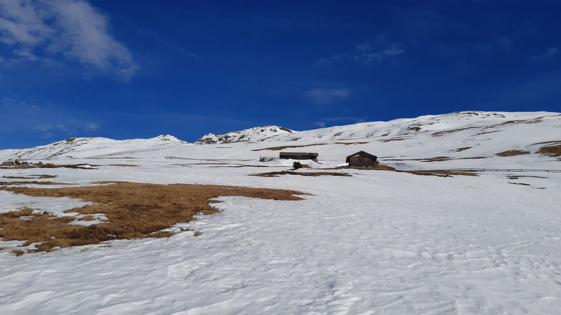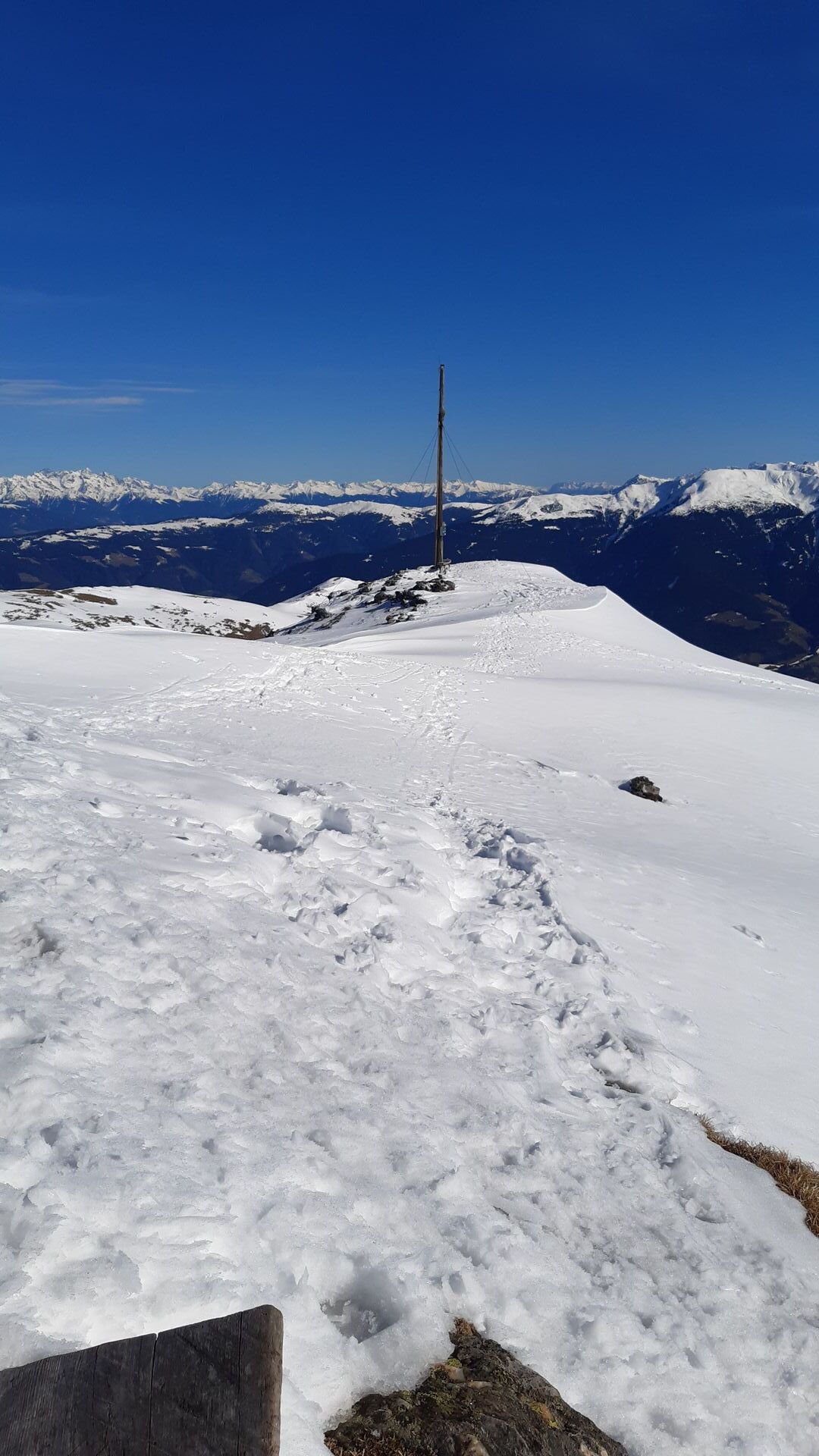 150 Höhenmeter vom PP weg bis zum Schnee ca.25 Minuten. Leichte Wanderschuhe angenehm. Bisschen den weißen Weg suchen-nur einmal abschnallen. Weites Almgelände- Gipfelkreuz sieht man erst oben. Der Schnee war mittags mal weich mal firnig. Aussicht Klasse. Schneeschuhwanderer waren in Gruppen unterwegs, ich war der einzige Skifahrer. 😊