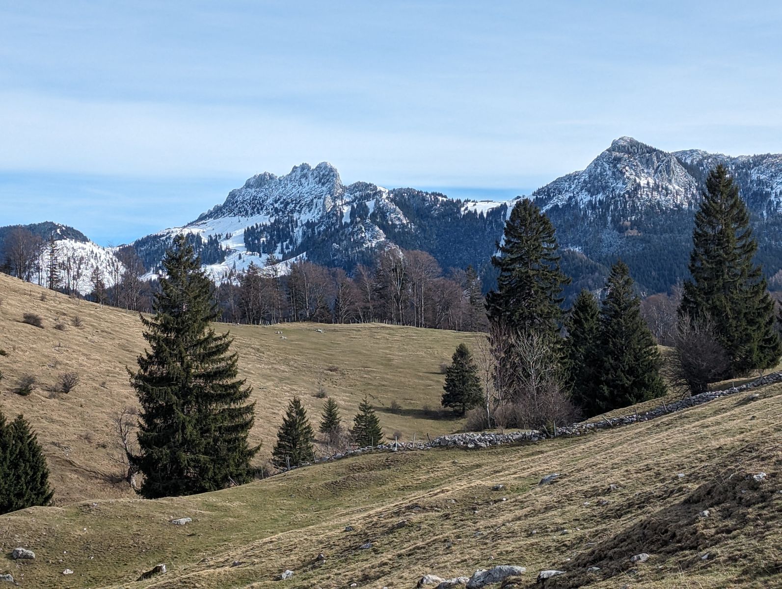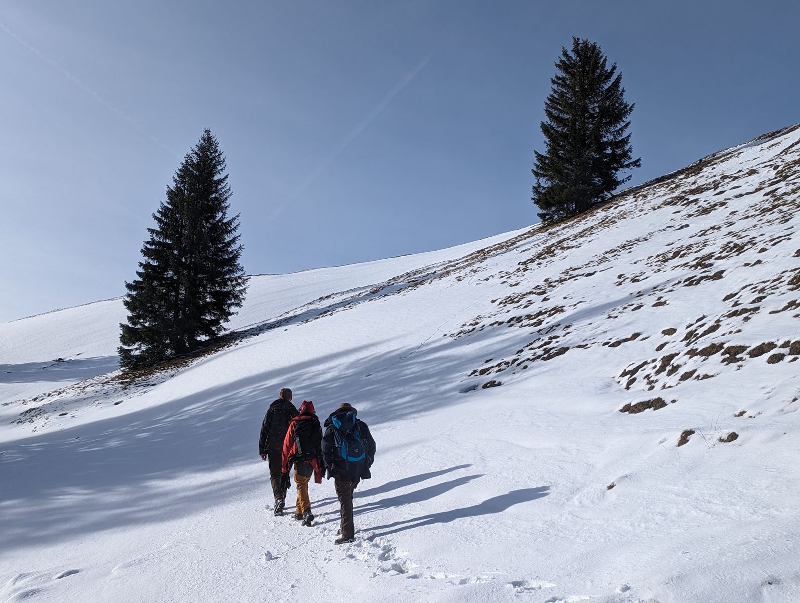 Die Wege waren bis etwa 1200 m schneefrei. Im Kessel der Hammerbachquelle lag dann 5 cm Neuschnee auf ca. 40 cm fester Altschneeunterlage. Der südseitige Gipfelhang war dann teils schneebedeckt, teils aper.