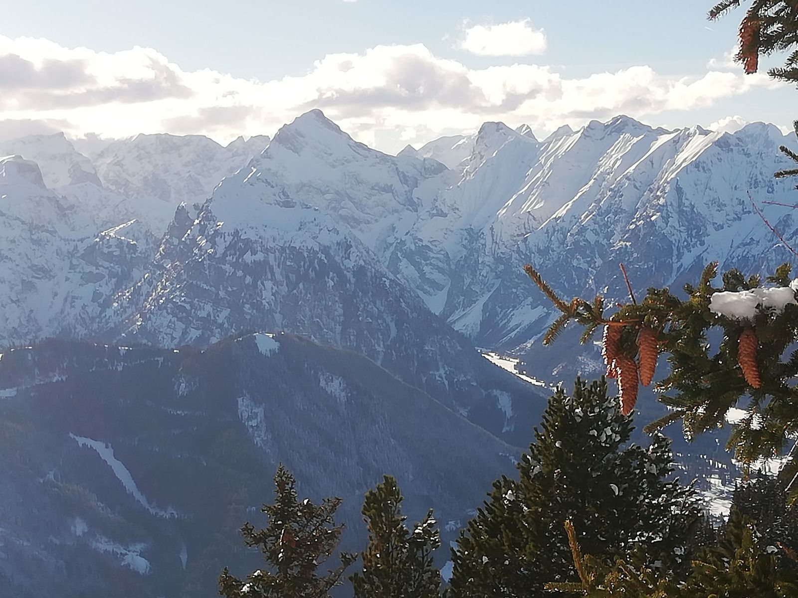 In der Abfahrt bereits stark verfestigter Pulver mit minimalem Harschdeckel. Noch ganz ordentlich zu fahren, am Roßkopf etwas besser, da der Föhnwind im Lauf des Tages deutlich zulegte und auch am dortigen Südhang etwas Schnee hängen blieb. Talabfahrt weiterhin nicht möglich. Ende des Schnees zwischen 1200 und 1300m.