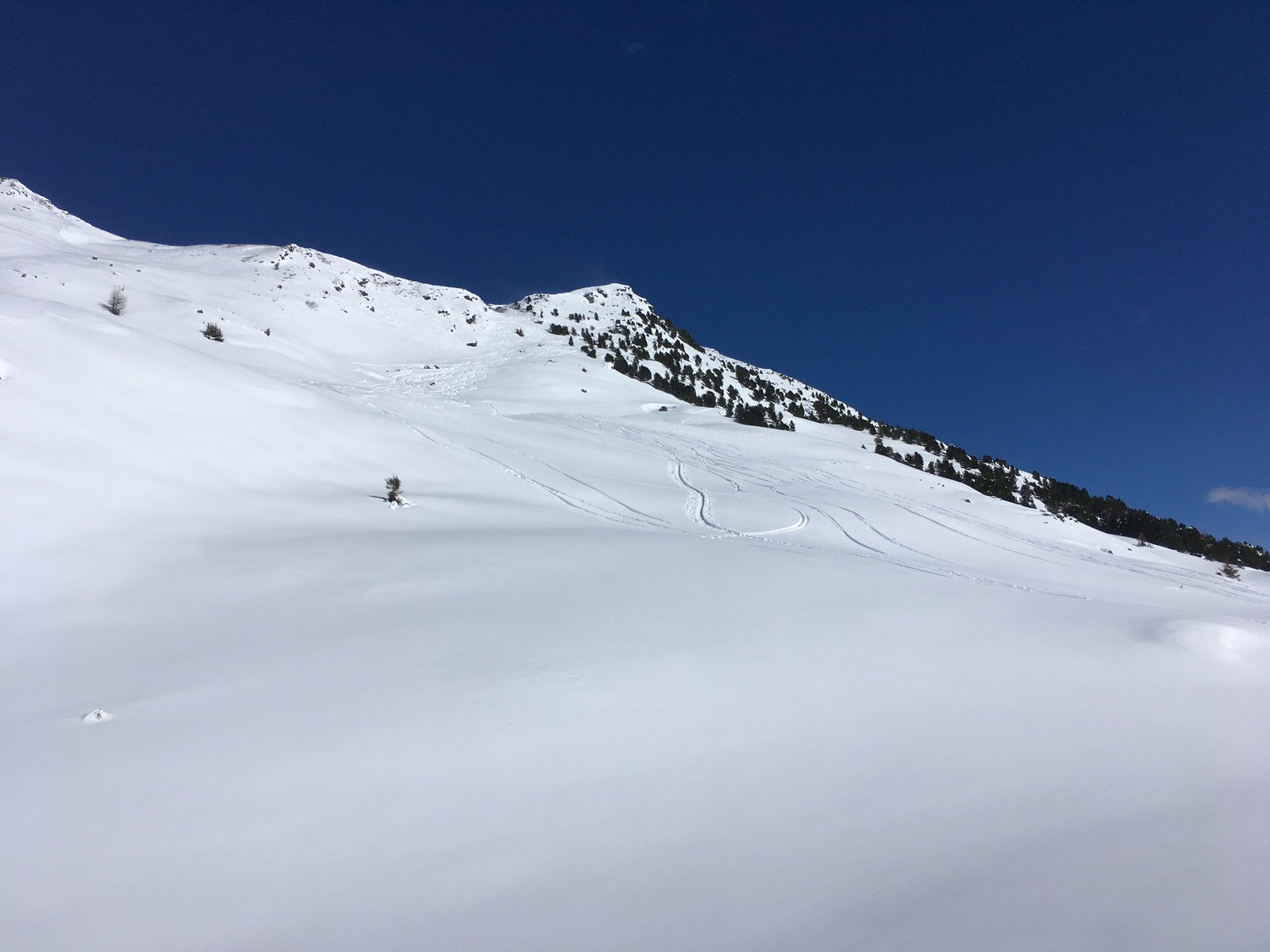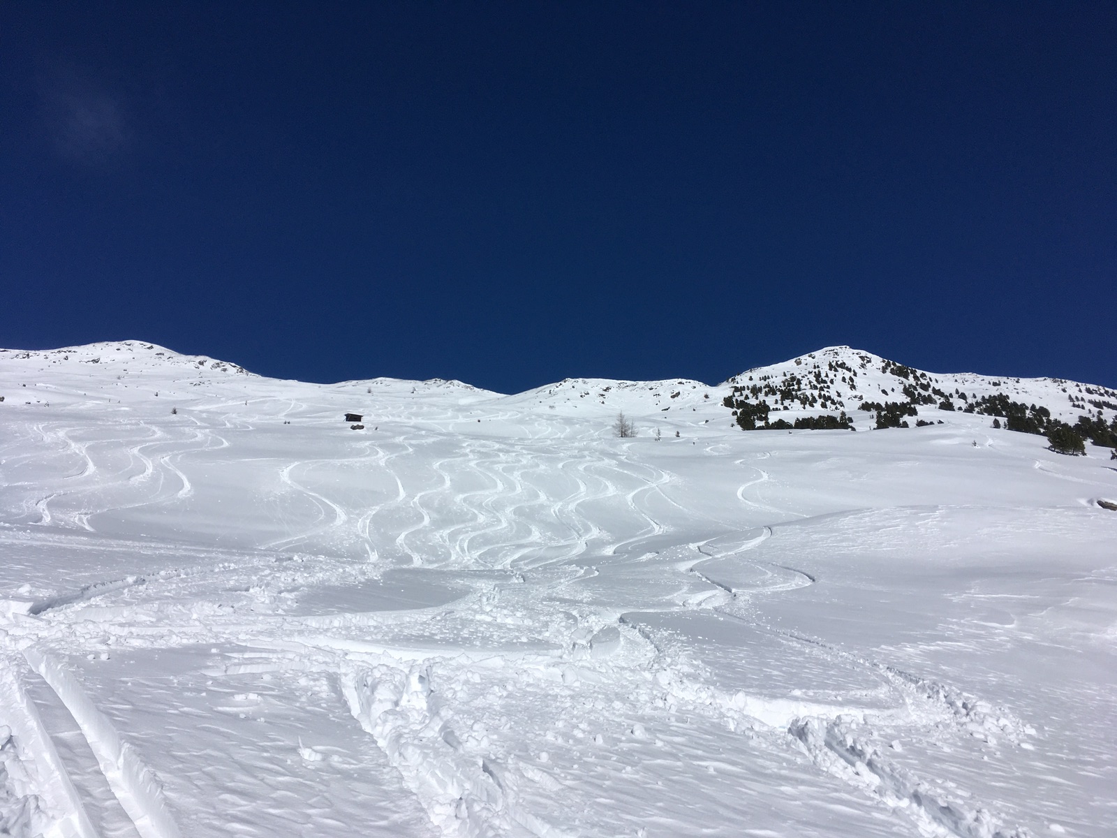 Abfahrt vom Rauhenkopf gestern häufig noch pulvrig (könnte sich mit der Sonneneinstrahlung rasch ändern):