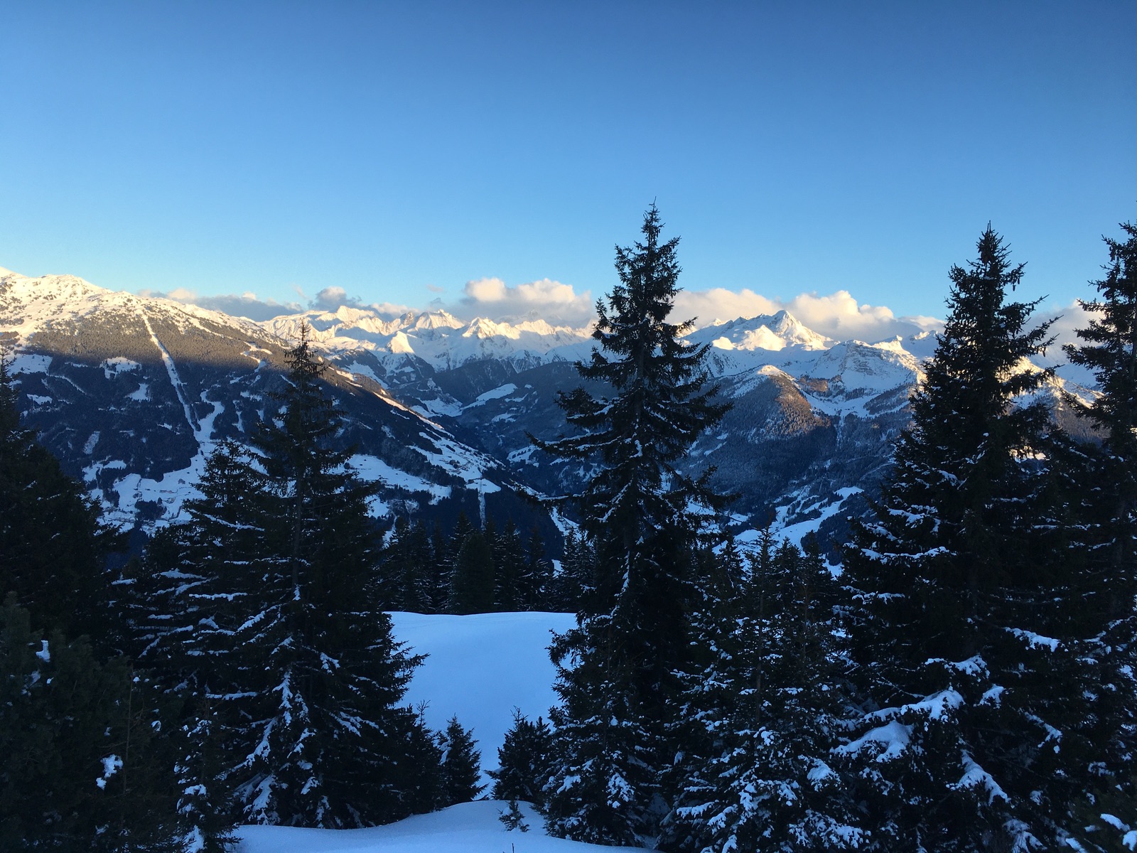 Letztes Licht über den Kitzbühelern und den Zillertalern von der Talabfahrt: