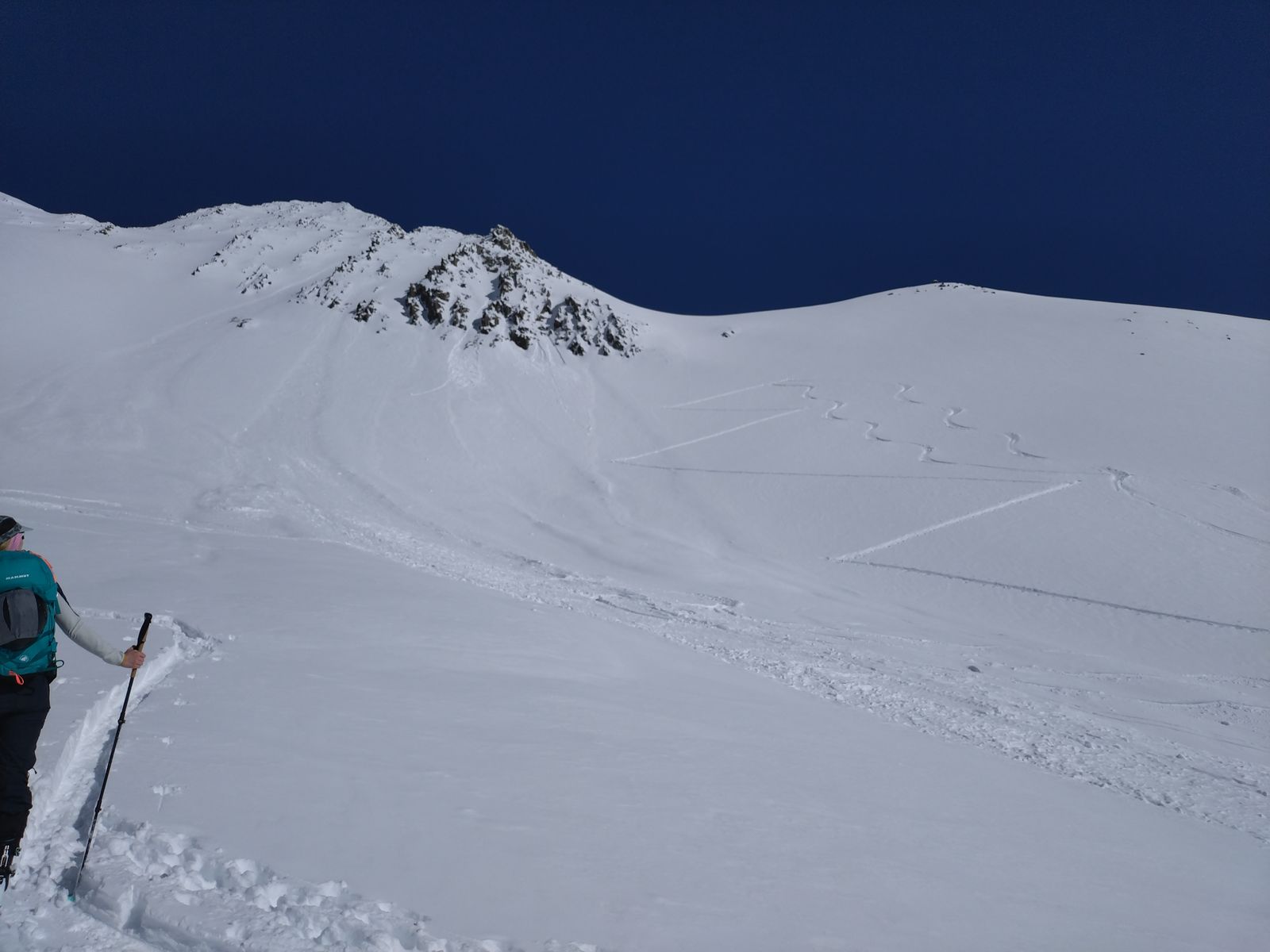 Kurz nach der Gabelung zum Rietzer ist vermutlich am Samstag aus der rechten Flanke eine grosse Lockerschneelawine abgegangen die auch ein ca. 50 m Flachstück überwunden hat (Bild 2)dann nochmal 150m später in ca 25 Grad steilen Gelände zum stoppen gekommen ist. Daher unbedingt auch die Auslaufflächen mit im Blick behalten. Das hat allerdings die Warnstufe 4 vom Vortag für uns zumindest bestätigt und sind daher bei unserem Schartenplan geblieben.