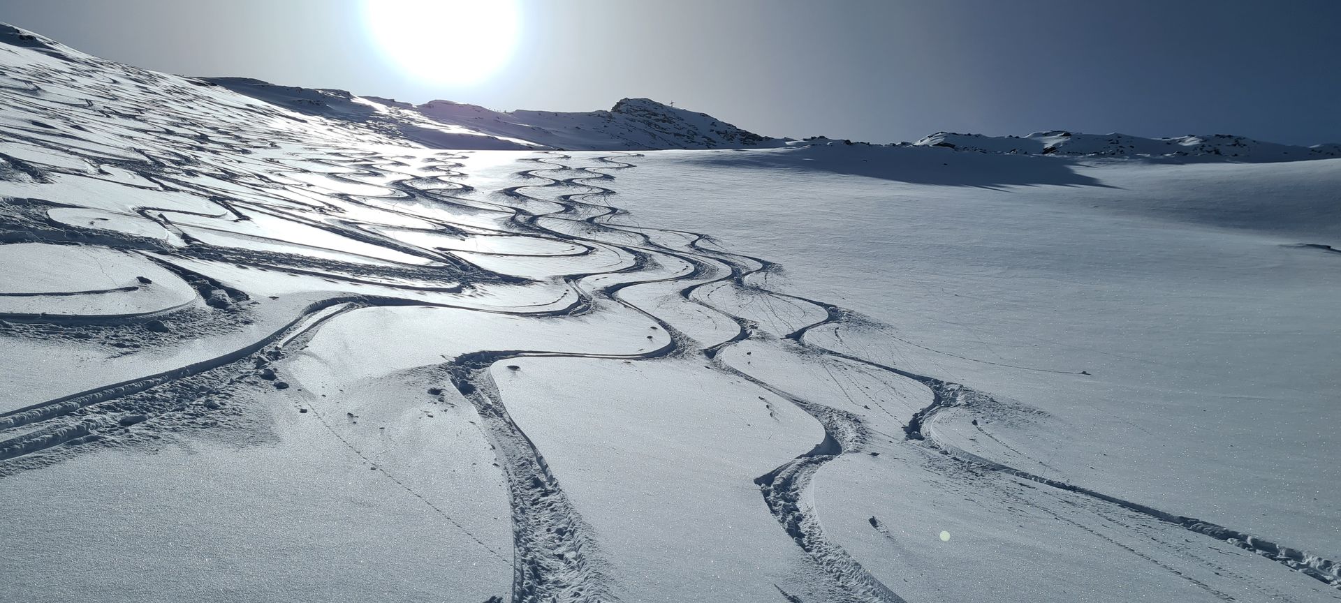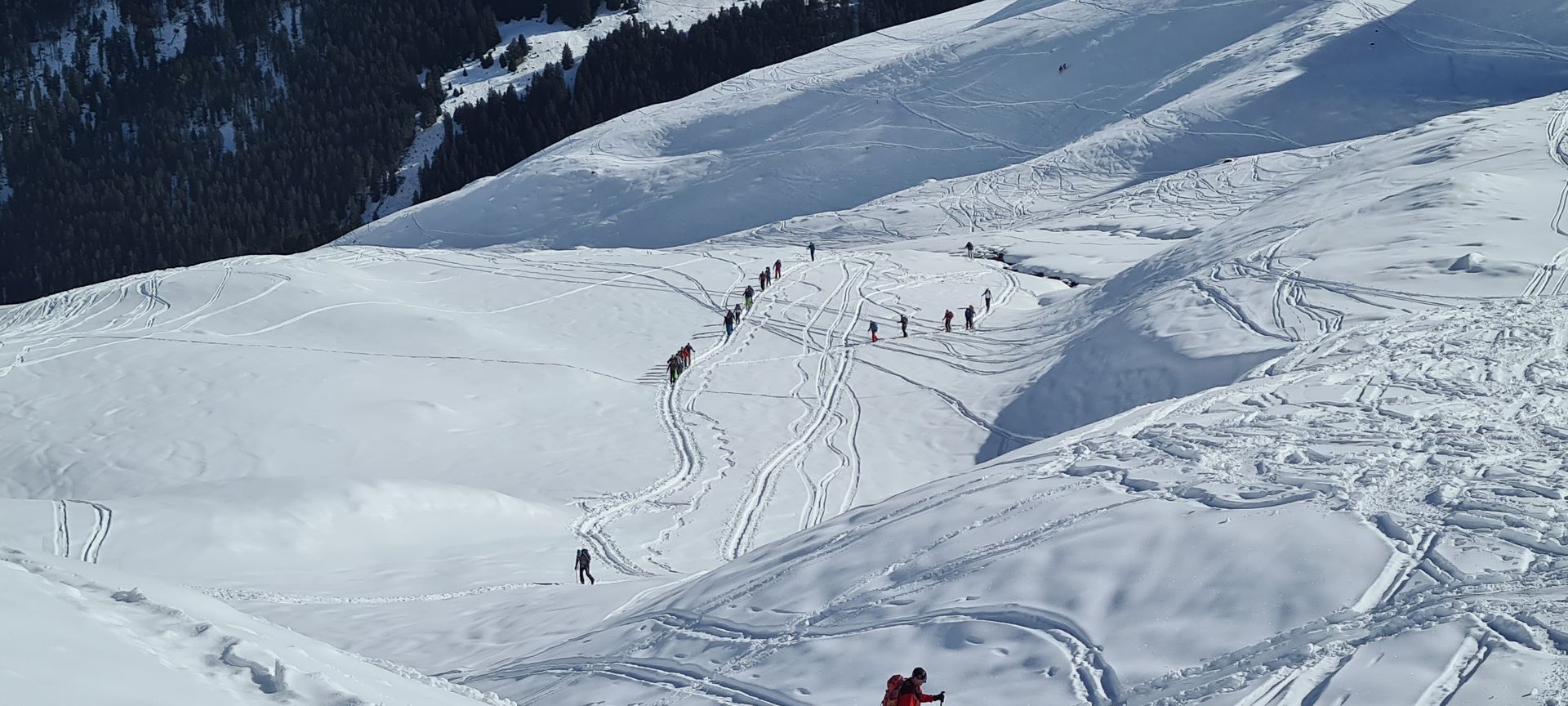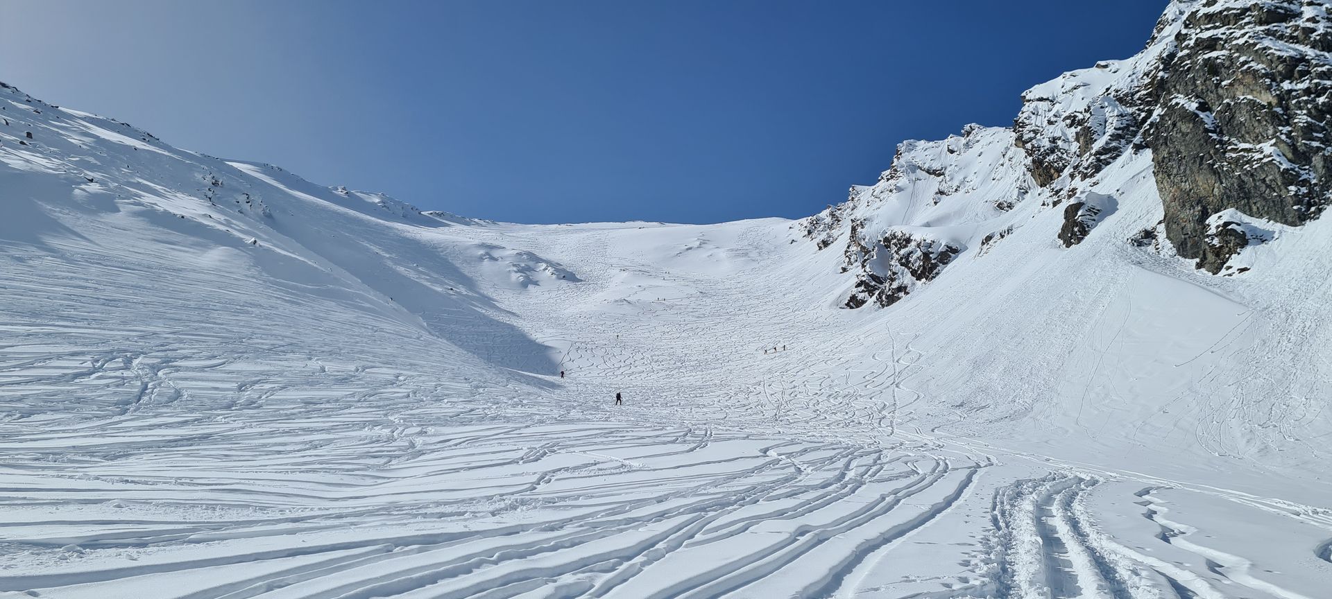 - Die Verhältnisse: Im Hochgebirge hat es außergewöhnlich gute Schneemengen in dieser Saison. Der Schnee war überwiegend pulvrig, teilweise etwas gepresster Pulver, aber meist gut zum Fahren, Freilich ist es schon recht verspurt, aber man findet immer noch einige freie Flächen. Das gilt freilich nicht für den unteren Bereich. Hier ist alles pistenartig eingefahren. Ich habe heute die Abfahrt durchs Sattelloch gewählt, da das weniger verspurt war.
