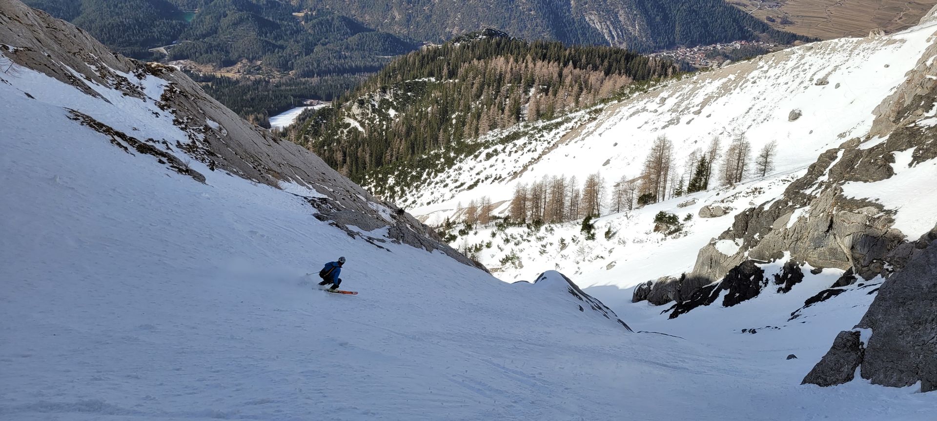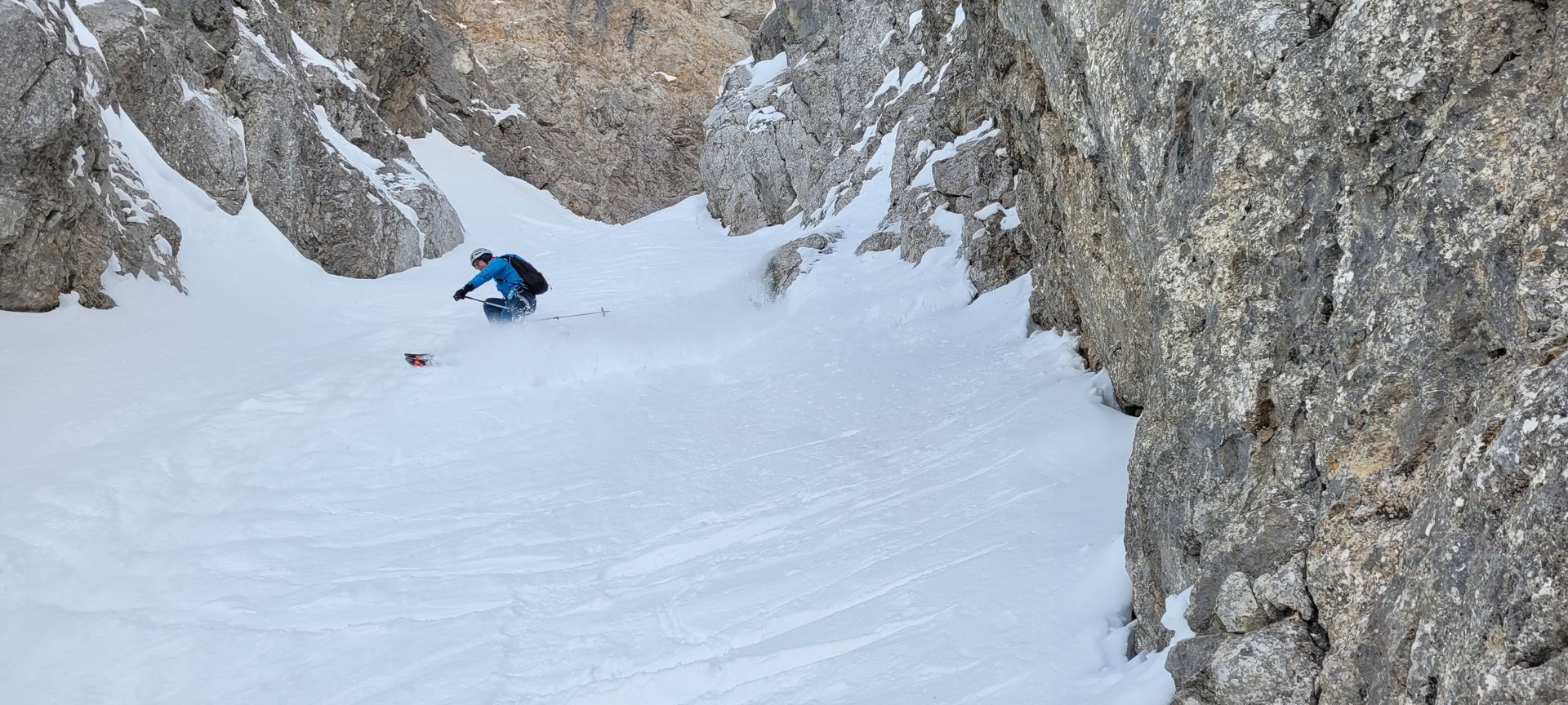 Rinne anfangs sehr steil (45 °) + eng. Sie bleibt anhaltend steil (37 °). Harter griffiger Schnee. Im unteren Teil oberhalb zweier Felsriegel unerwartet eisig. Kräfte- + Atemberaubende Abfahrt. Leider kein Pulverschnee mehr, dafür auch keine Lawinenboller in der Rinne.