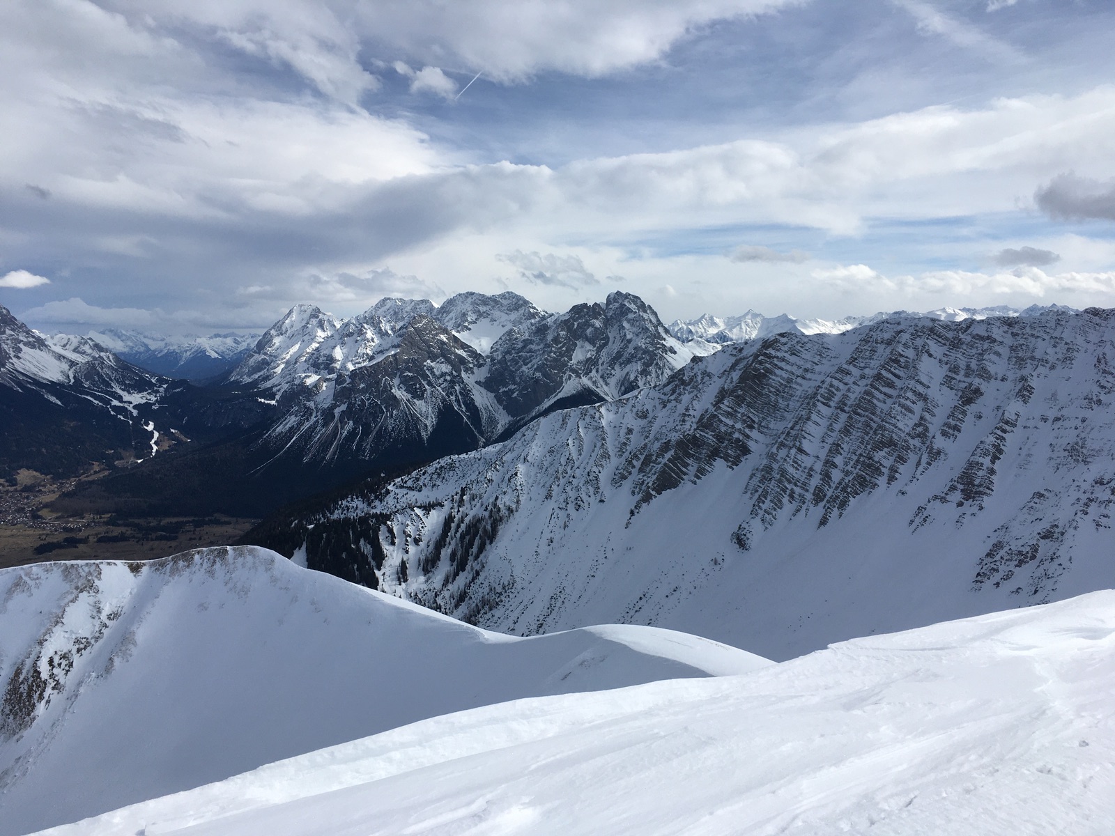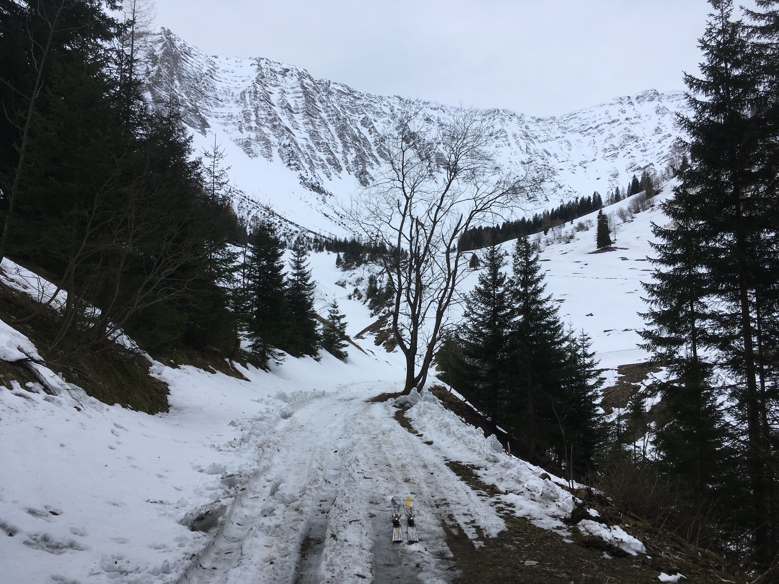 Aufstieg vom Bhf. in Lermoos über Untergarten und den Forstweg (mit Steigabkürzer) zur Gartner Alm. Der skitourentaugliche Schnee beginnt kurz vor der Gartner-Alm, d.h. ca. 1 h Skier tragen. Entlang des Baches im Gartner Tal ginge der Schnee wohl deutlich weiter hinunter und es scheinen fast alle Grundlawinen unten zu sein, aber mir bleibt diese Aufstiegsvariante suspekt. Ab der Gartner Alm liegt durchgehend ausreichend Schnee, abgesehen von einigen Metern auf ein paar Rippen, wo die Grasbüschel hervorgekommen. Für die steilere Aufstiegsquerung habe ich die Harscheisen angelegt.