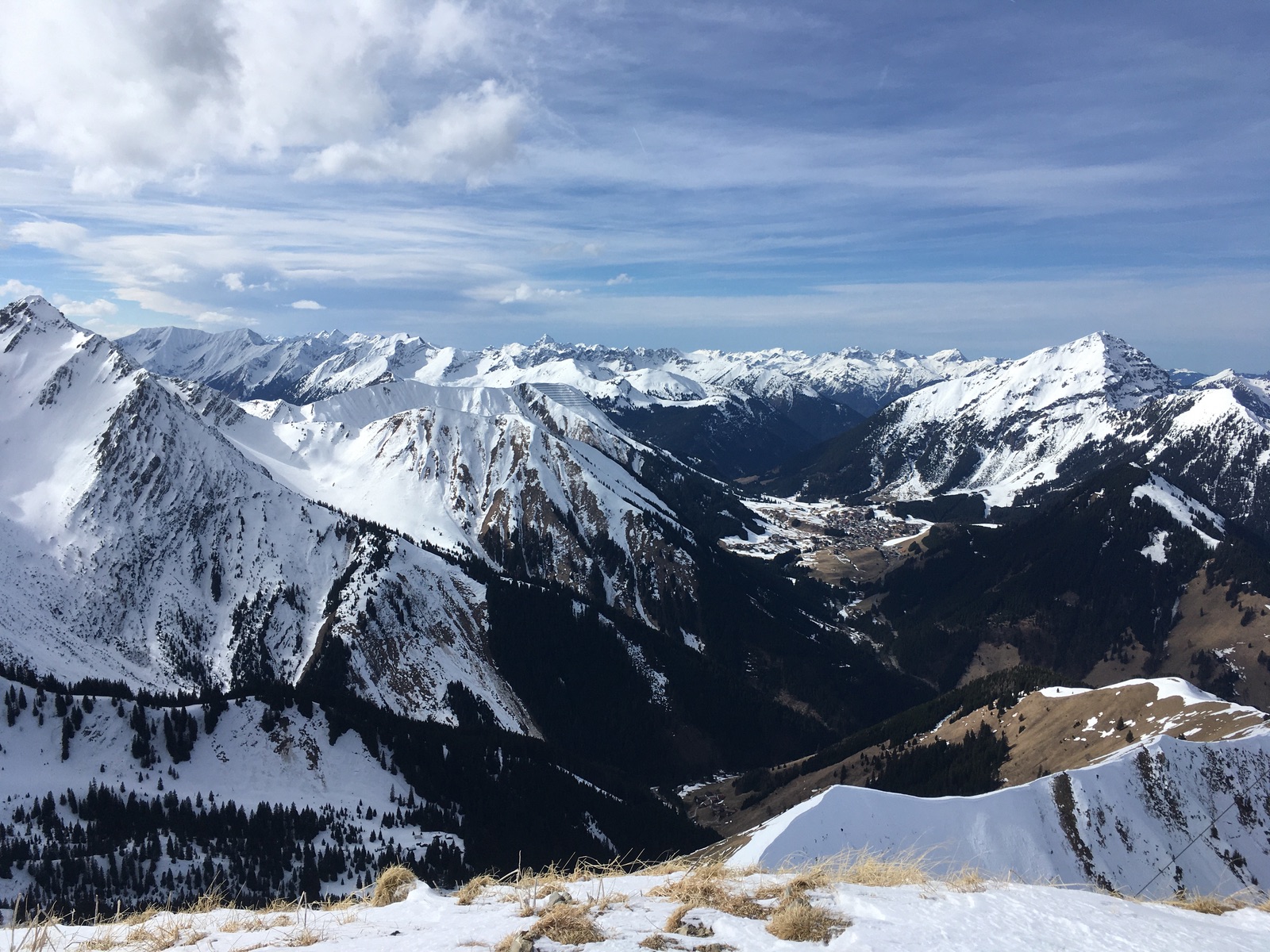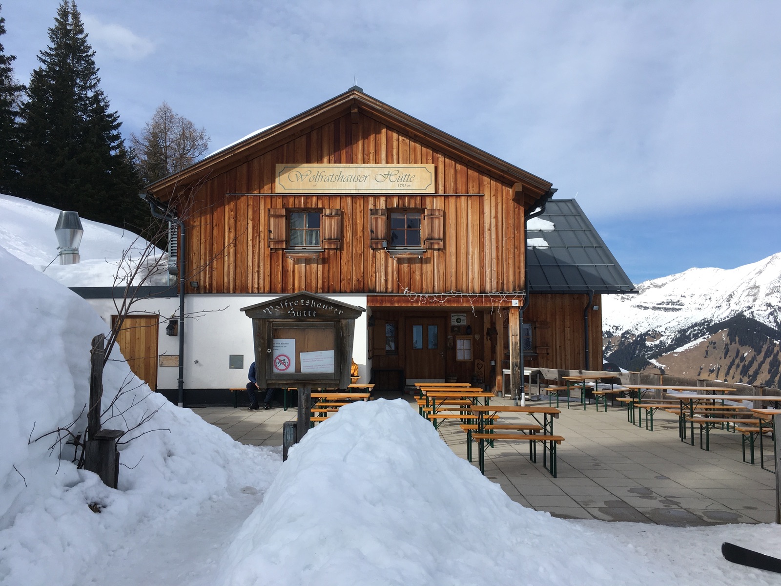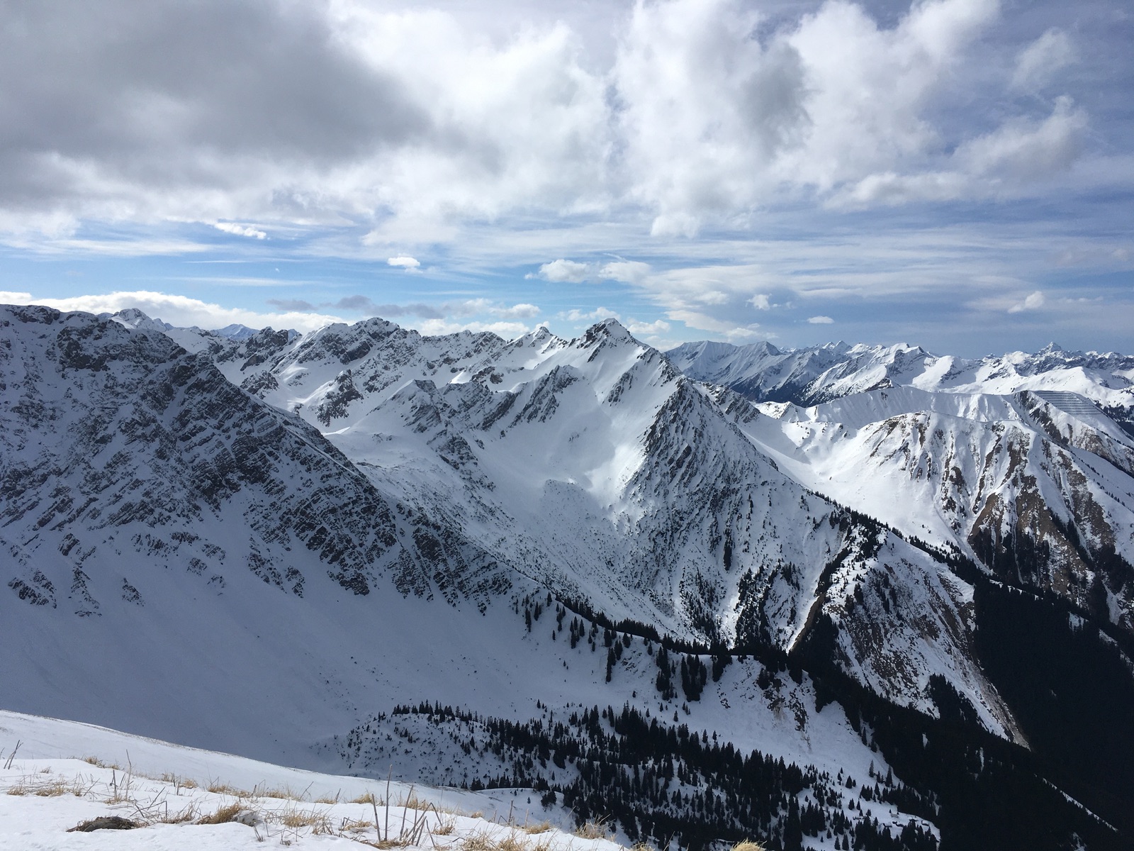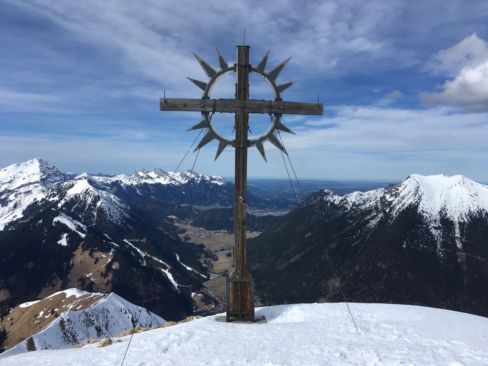 Keine Tourengeher unterwegs auf dieser beliebten Tour (das Skiertragen schreckt wohl man wieder viele ab?), erst am Gipfel traf ich eine größere Gruppe. Vormittags war es entgegen meiner Erwartungen noch bedeckt und ziemlich windig, dann kurzzeitig sehr sonnig und damit warm (wobei die Grundtemperatur ohnehin hoch war, 12 Grad im Tal am Vormittag). Die anderen Tourengeher sind wohl alle von Bichlbächle aufgestiegen, wo es "bedingt durchgehend schneebedeckt" (Zitat) gewesen sein soll.