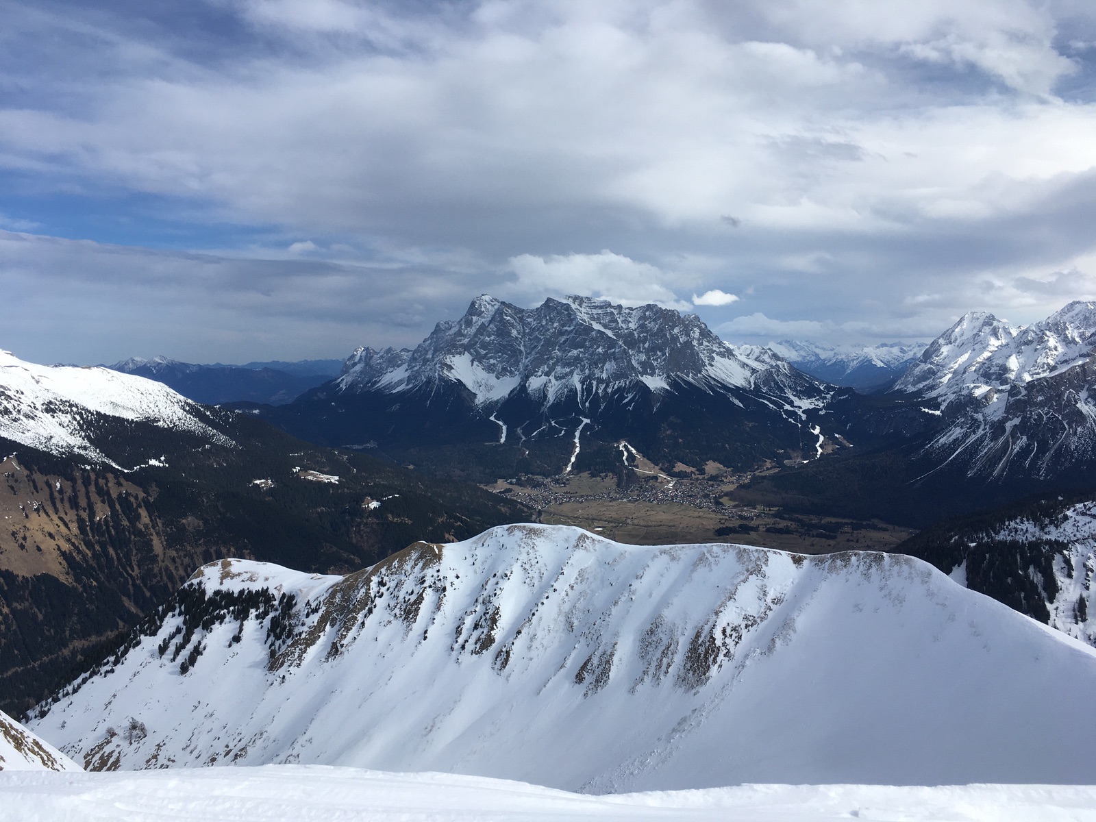Die Abfahrt über die Pisten nach Lermoos sind noch offen, unterhalb der Mittelstation an einigen Stellen aber schon lückig. Das wird wohl nur noch ganz kurz durchgehend gehen, trotz Kunstschnee. Insgesamt liegt im Gebiet eigentlich unterhalb 1.300 m praktisch kein Schnee mehr, häufig gar 1.500 m - sonnseitig ist die Schneegrenze sogar noch weiter oben. Die Pisten weisen oben einige eisige Stellen auf - mit den alten Tourenskiern nicht ganz ideal.