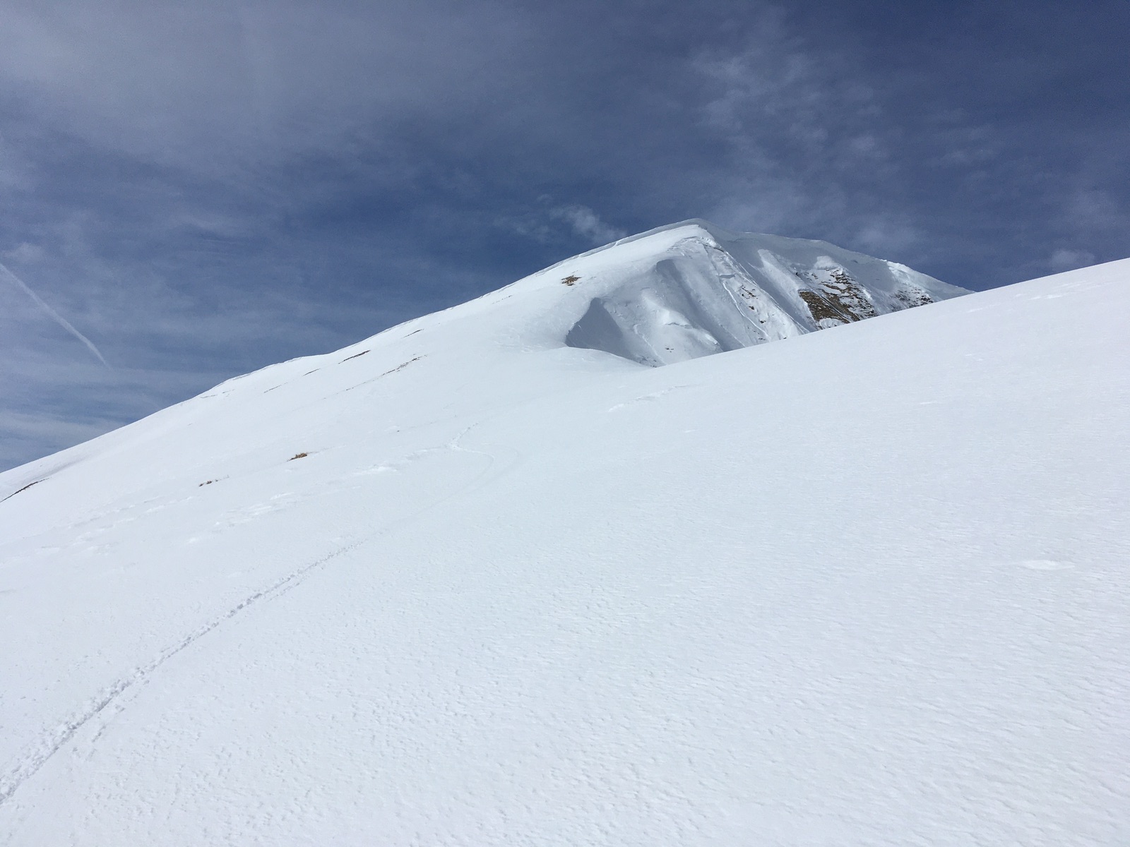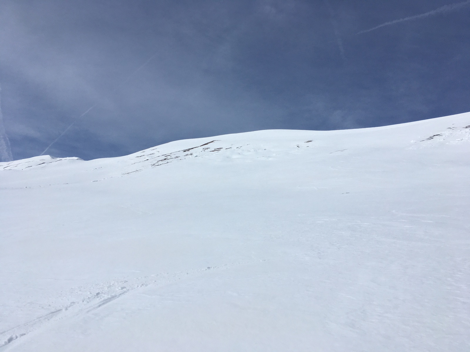 Die Abfahrt dann nur ganz oben mit den vielen, nicht "aufgegangenen" alten Spuren ruppig, restliche Abfahrt über "glatten" Harschdeckel bzw. unten aufgefirnt. Schön! Wesentlich besser als gedacht, für durchgehenden Firn hat heute einfach die Sonneneinstrahlung gefehlt. Nur ganz unten ein paar bruchharschige Meter. Achtung: Auf einem der von oben wie unten super aussehendem Abfahrtshänge warteten mitten im Hang einige (noch) kleine Gleitschneeanrisse - also irgendwann wird wohl auch dieser Hang abgehen, wie schon einige der benachbarten Hängen (und im Gartnertal leider häufig). Die steile Nordabfahrt kurz unterhalb des Gipfels kann man übrigens vergessen, völlig verunstaltet von Lawinen.