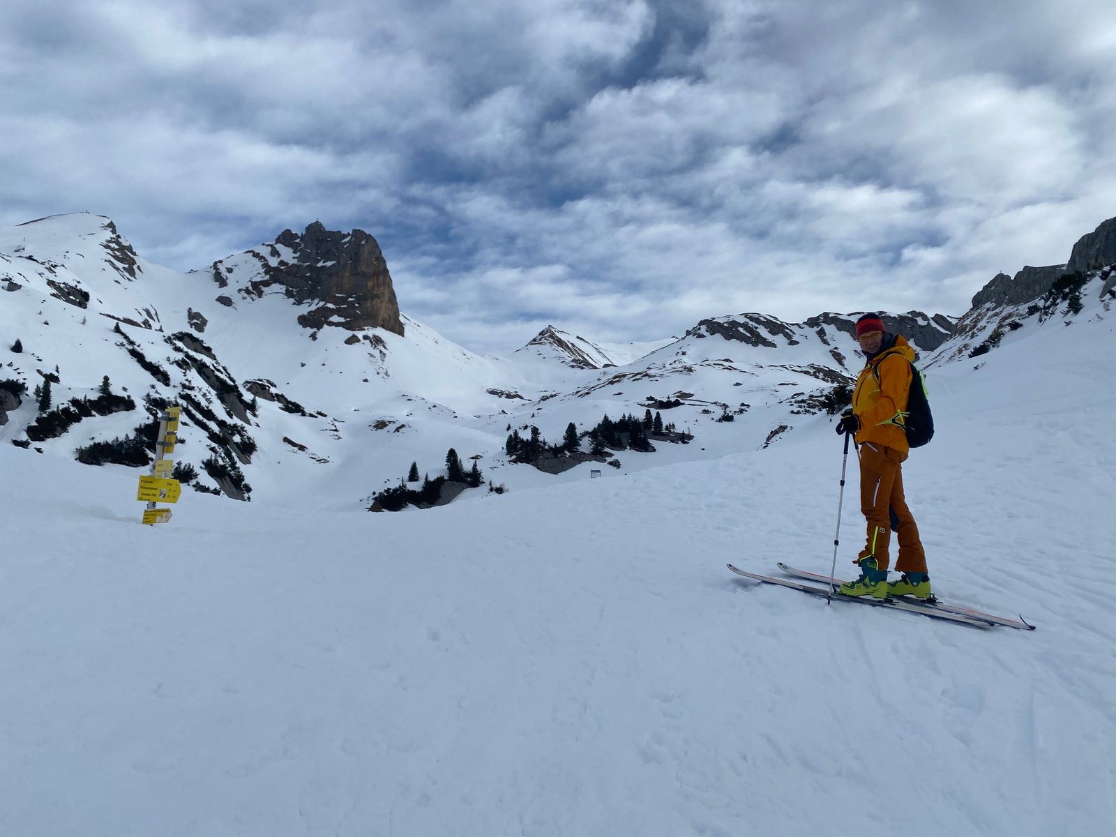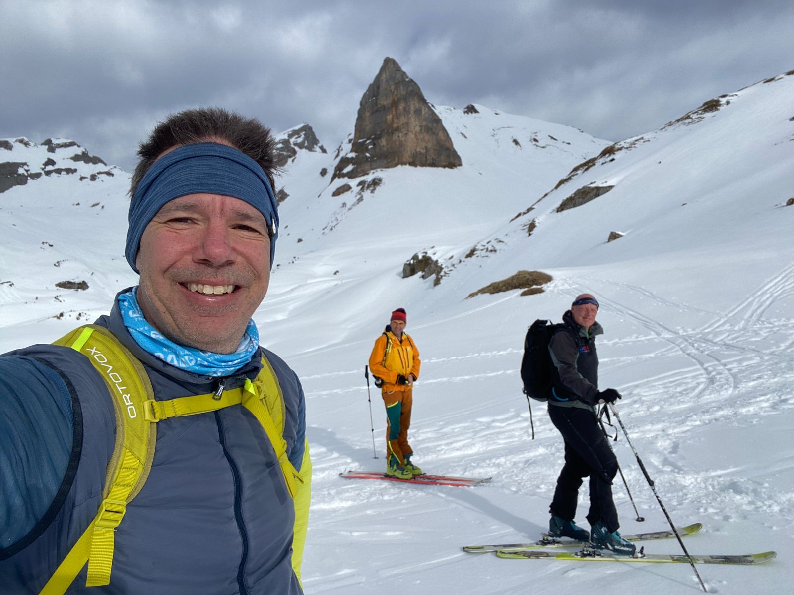 Am Gipfel blies der Föhn so stark, dass wir die Pause sehr kurz hielten - für die erste Abfahrt wählten wir zunächst den Hang nach Osten (also links runter) und dann im Prinzip die klassische Wiesingabfahrt. Im diffusen Licht und bei bisweilen bockhartem Schnee (vom erhofften Firn keine Spur) ging es hinunter zur Schermsteinalm, in deren Windschutz wir Brotzeit machten. Sicht und Schneequalität wurden nun besser, sodass wir uns fürs Weiterrunterfahren entschieden - es folgten weitere etwa 350 Höhenmeter in nun endlich etwas Firn, bis auf ziemlich genau 1500 Metern Höhe der Schnee schlagartig schlecht wurde: Statt im Firn zu cruisen brachen wir ein.