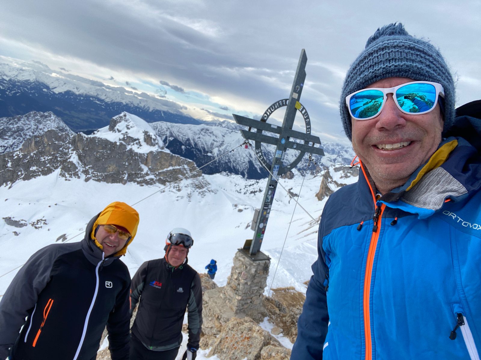 Start also um 9 Uhr auf 1800 Metern Höhe an der Erfurter Hütte, wo der Föhn ordentlich blies. Weil die Wolken meist die Sonne verdeckten, firnte es auch den ganzen Tag über fast nirgendwo richtig auf. Bis zu Grubascharte/Krahnsattel ging es problemlos, danach waren wir froh, die Harscheisen zu montieren - die Spur im Gipfelhang zur Rofanspitze war hart, aber mit Eisen gut machbar.