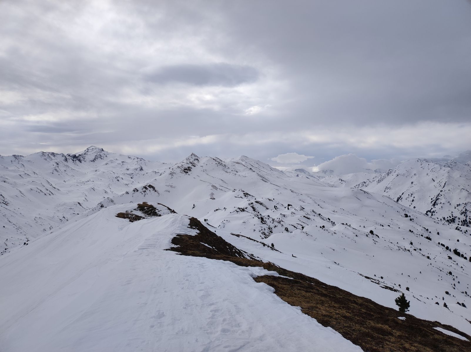 Hier nur ein kurzer Bericht zu den Verhältnissen oberhalb vom Innerst. Ich hatte gestern wie Martin auch besseres Wetter erwartet und auf Firn gehofft. Plan war über das Nurpenstal hoch, evtl einmal (im Firn, da Osthang) runter, nochmal hoch und dann (mit Zwischenabfahrt) zur Nafingspitze rüber und westseitig zur Weidener Hütte und via Rodelbahn zum PP. Letztlich wurde es nur die Überschreitung der Rosslaufspitze, da die Wolken ein Auffirnen verhinderten und der Föhnsturm ziemlich unerträglich war. Ganz mieser Bruchharsch in der Abfahrt, aber so was kommt halt vor...