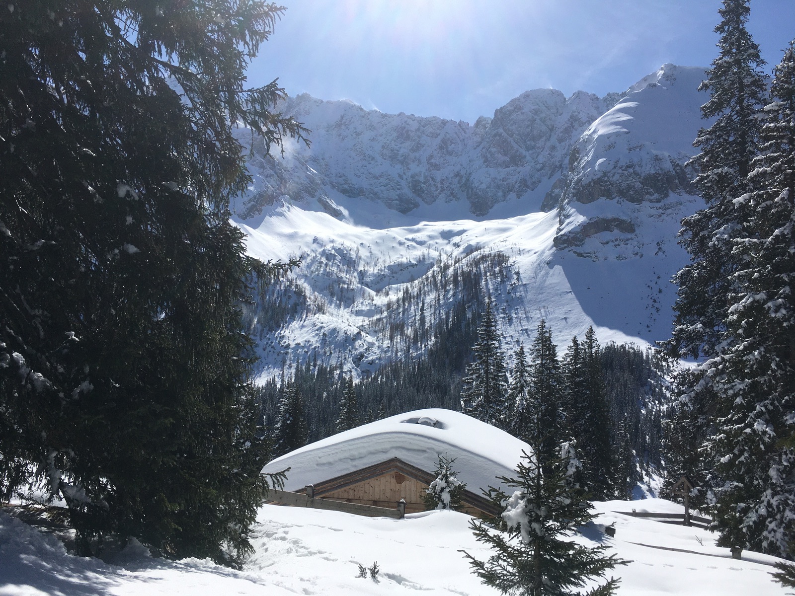 Richtung Gaistal kommt man an dieser schönen Hütte vorbei - die Schneelage oben gut, wie man sieht; hinten das Igelskar: