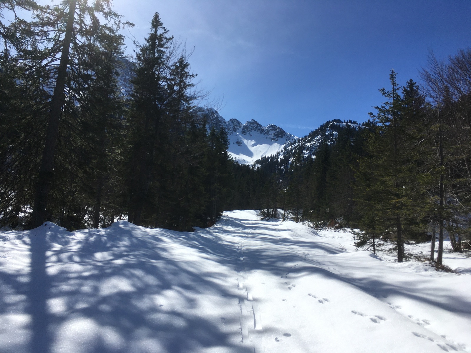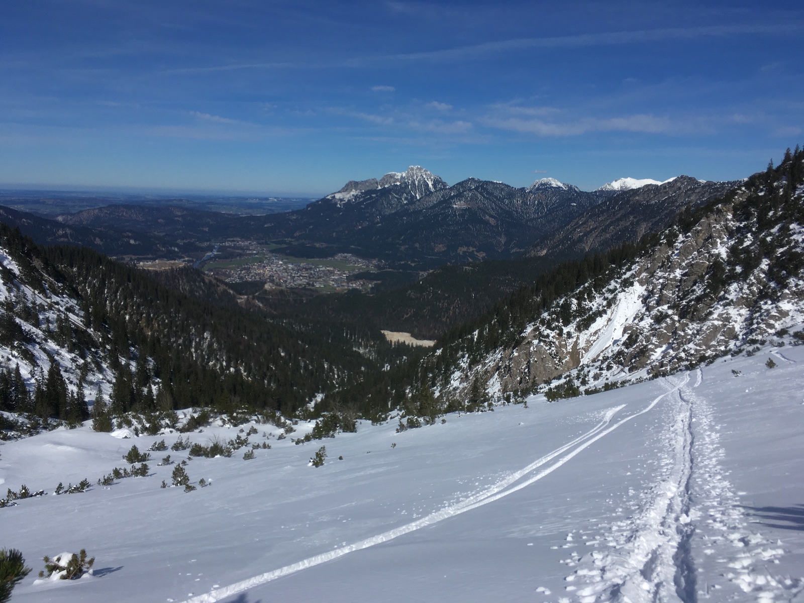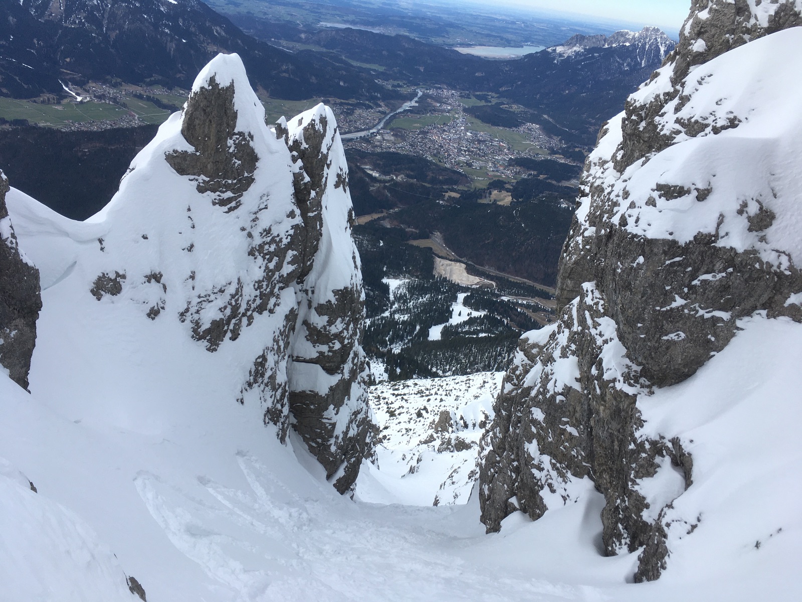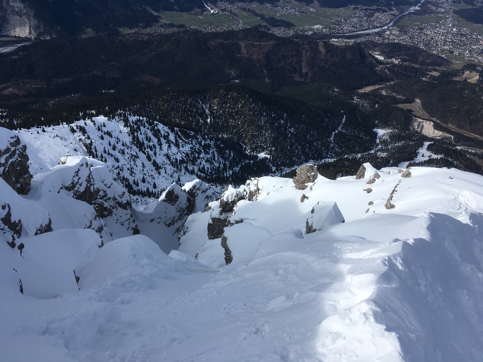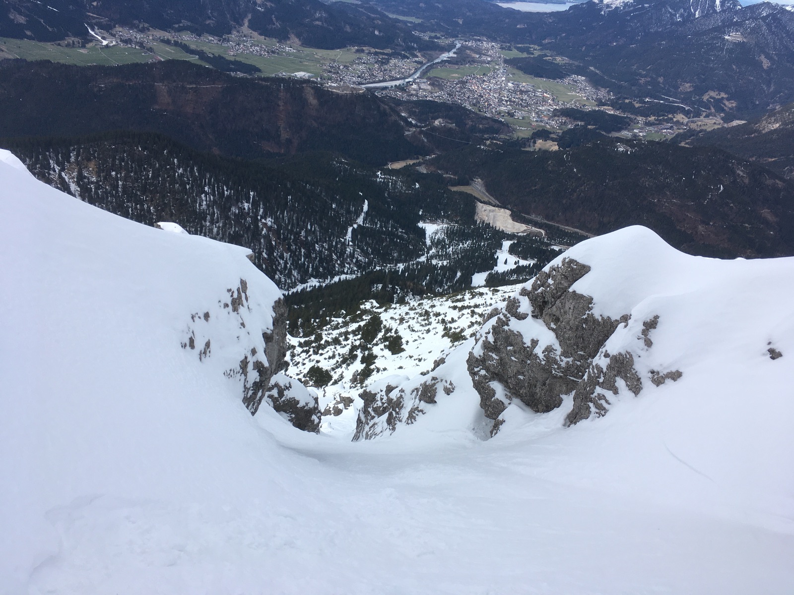 Vorsichtig sein muss man derzeit auch unterhalb der Rinne: Es schaut so schön aus, aber es lauern Felsen unter der Schneedecke - mich hat es ganz übel und völlig unerwartet bei so einem aufgestellt. Im Wald ab ca. 1.500 m liegt auch fast nur der Neuschnee und man kommt bei den Schwüngen bis auf den Waldboden durch. Daher auch die alten Skier.
