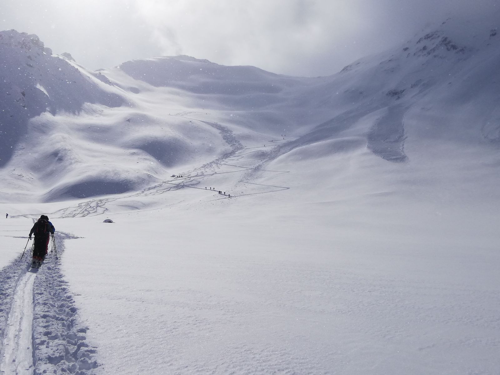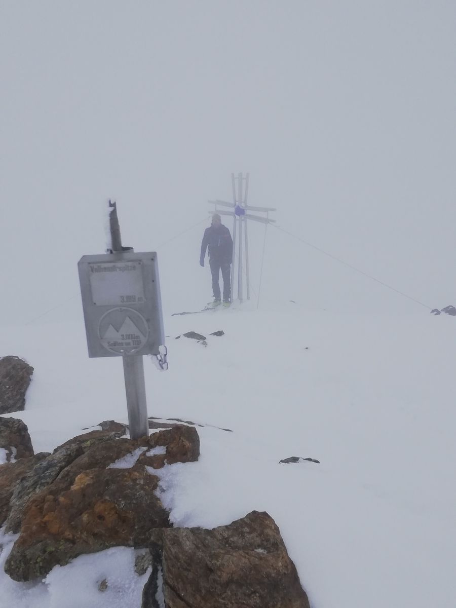 Am Freitag von Kappl über die Piste nach Maseben, von dort lange Querung Richtung Südost, bis man in das Rotebenkar einbiegen kann. Durch dieses zur Scharte 3064m und von Süden her zum Gipfel. Im Kar etwa 20-30cm Neuschnee, sehr guter Pulverschnee, windstill, ab der Scharte starker Südwestwind, Gipfel ganztägig in Wolken. Abfahrt direkt zur Melager Alm und von dort zurück mit einigem Schieben entlang der Loipe.