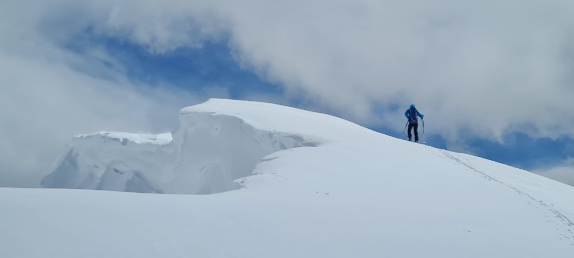 Im oberen Bereich war es recht windig, die Schneedecke recht windgeprägt und es gab neue Triebschneeansammlungen. Mit etwas Umsicht konnte man aber zwischen tragendem Windharsch oder in den Fachbereichen harmlosen Triebschneefeldern wählen. Beides ging gut zum Fahren.