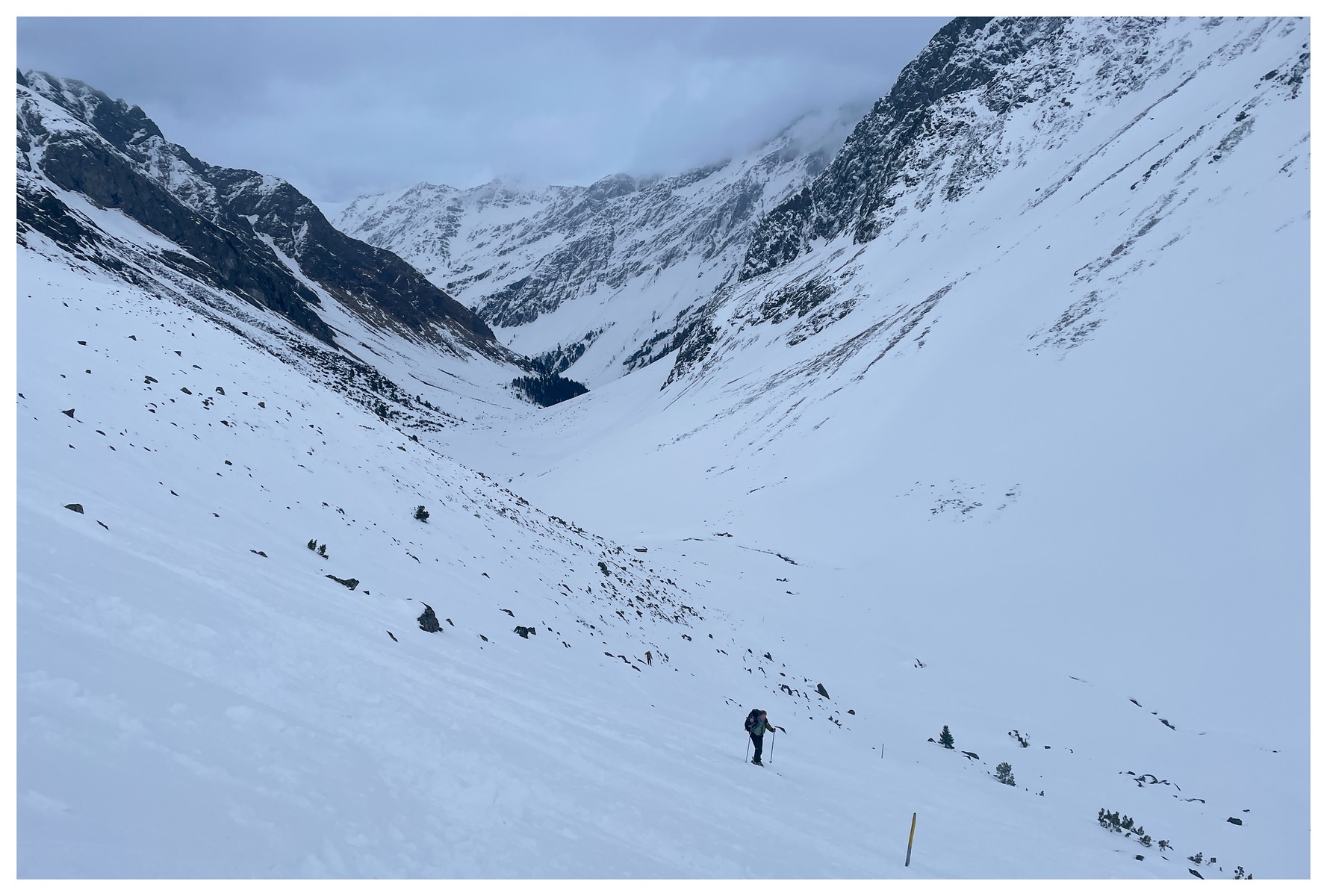 Heute stand der Längentaler Weißerkogel auf dem Programm: ca. 10 cm Neuschnee (was nach wenig klingt, aber man hat dadurch keine Aufstiegsspuren vom Vortag mehr gesehen und da waren es dann plötzlich 10 cm + X). Auf knapp 3.000 m haben wir beschlossen, umzukehren (man hätte weitergehen können, aber die Gipfelflanke hoch, um dann im Nebel am Gipfelkreuz zu stehen und nichts zu sehen und unter Umständen dann im WhiteOut wieder runterzupflügen (so hatte sich zumindest der Wetterbericht gelesen und es sah so aus, als dass er Recht behalten würde - hatten wir keine große Lust drauf