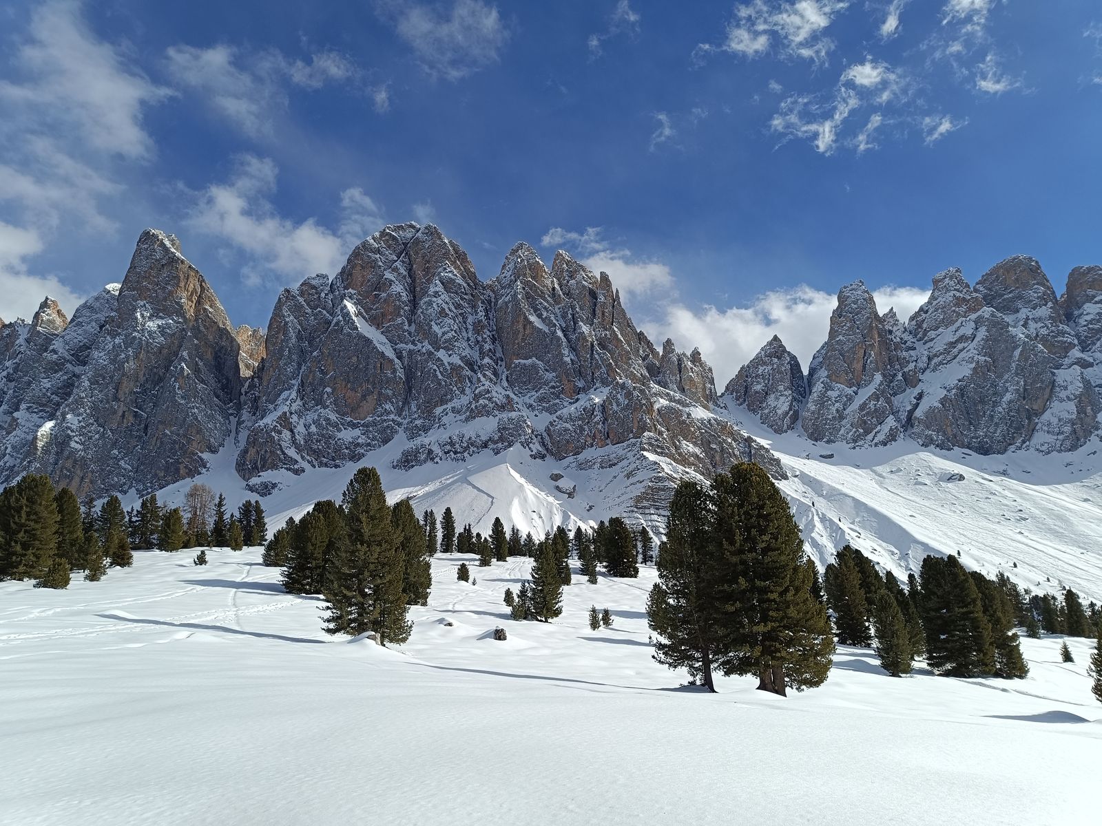 Schneeverhältnisse allgemein: Auch nordseitig sollte der Ausgangspunkt in den Dolomiten nicht unter 1500 liegen, ab 2000 Meter super Schneelage und in schattigen Rinnen/Karen auch noch Pulver.