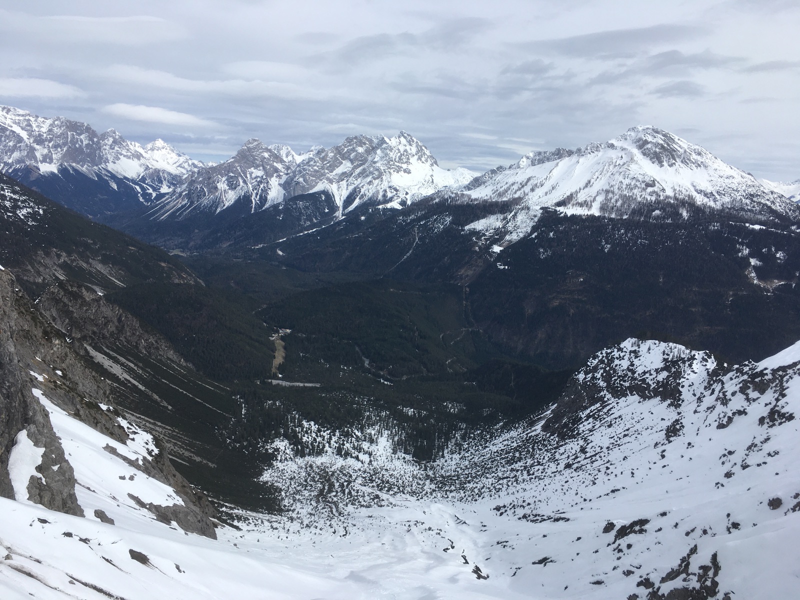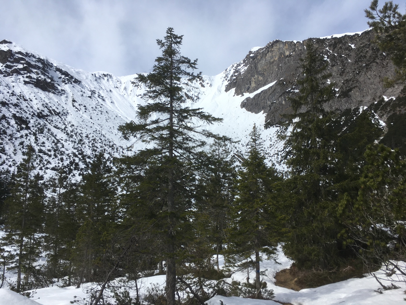 Oben im Afrigall beginnt der Schnee - man kann angefellt gehen, es kommen aber immer wieder Schneelücken. Am (flachen) Beginn der Reise der Fernpassrinne liegt recht wenig Schnee (offene Steine & Latschen; gestern war der Schnee dort auch wegen viel zu warmer Nacht und wohl teilweise fehlender Abstrahlung sowie sehr hohen Tagestemperaturen nicht tragfähig) - Vorsicht hier v.a. in der Abfahrt. Danach geht es - nach oben hin steiler werdend - gefühlt eine Ewigkeit die Rinne hoch. Mit dem Nassschnee bis auf ca. 1.900 m hinauf gestern eine kraftraubende Sache und etwas öde/monoton.