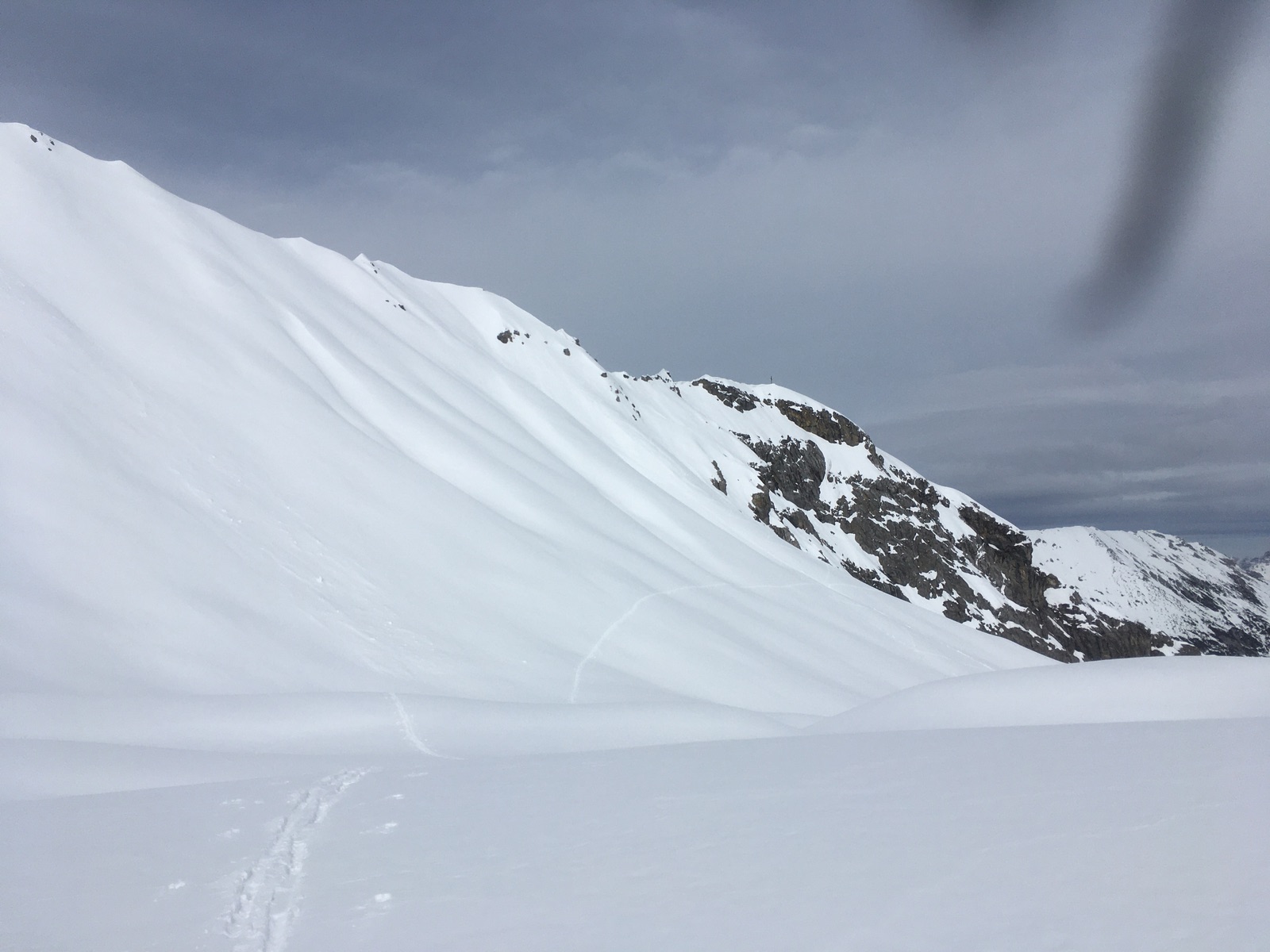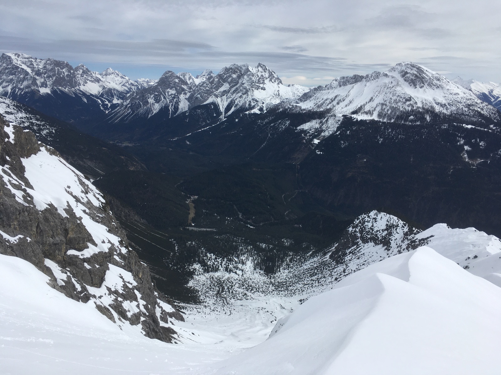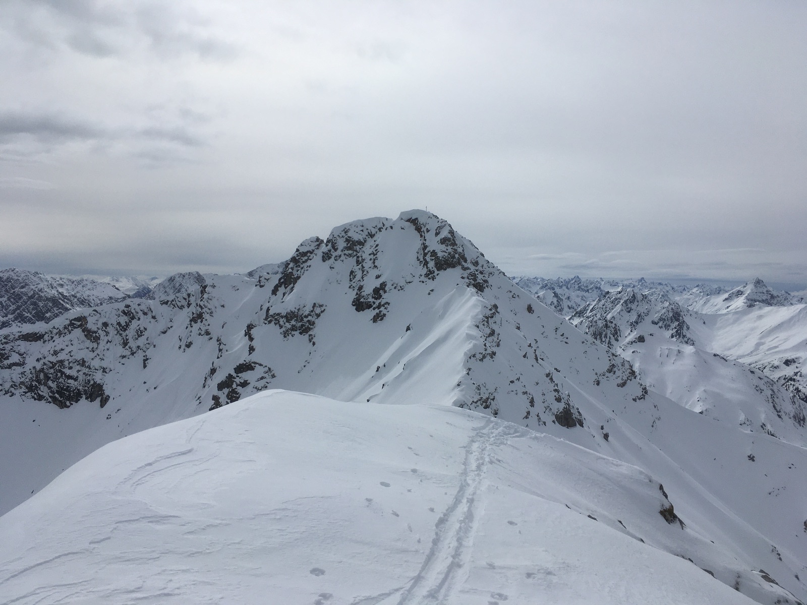 Am oberen Ende der Rinne bin ich dann zum Tagweidkopf gequert - einige Meter Höhenverlust und dann auch Pulver ---> übelstes Anstollen. Alternativ könnte man auch direkt weitersteigen zu einem der Gipfel des Kreuzjochs. Über der Querung zum Tagweidkopf hängen gewaltige Wächten - etwas gruselig war, dass da, wo ich im Aufstieg hoch bin, später in der Abfahrt ein Teil der Wächte abgebrochen war und als Lawine abgegangen war ...