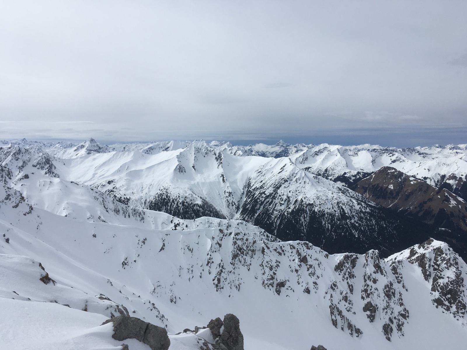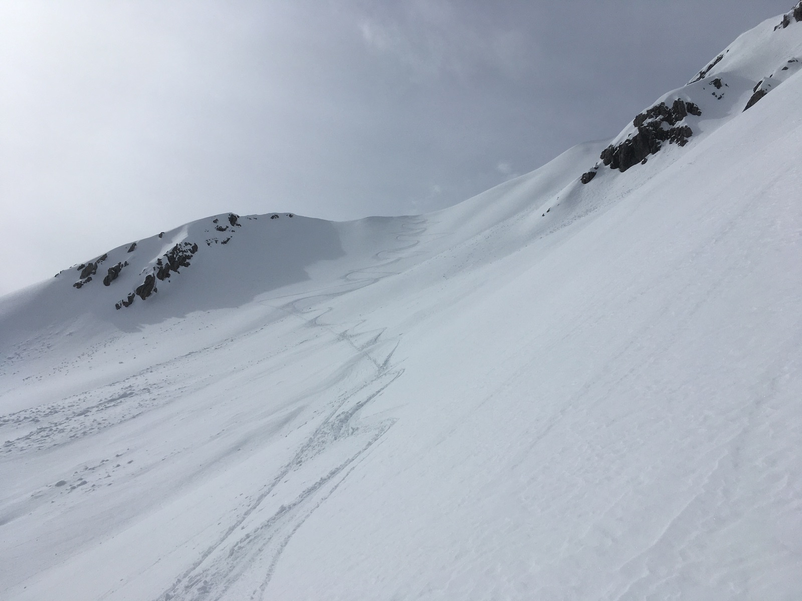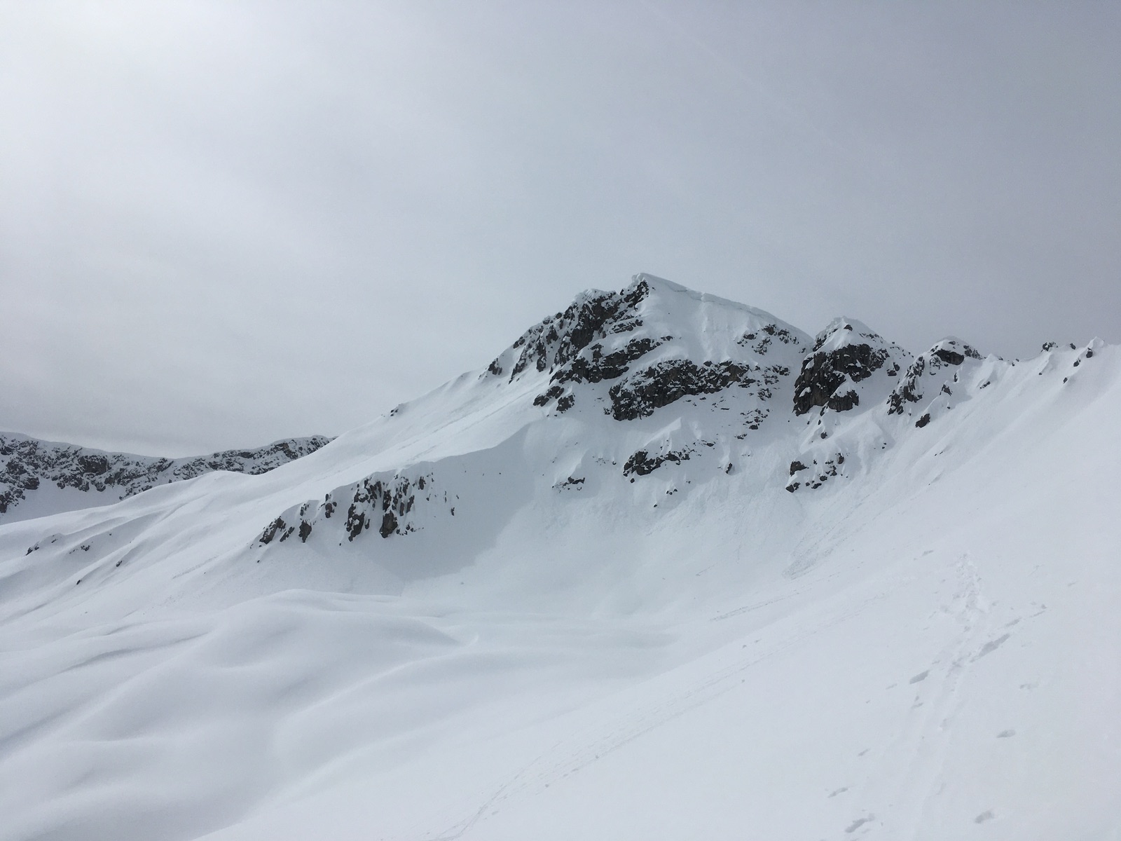 Am oberen Ende der Rinne bin ich dann zum Tagweidkopf gequert - einige Meter Höhenverlust und dann auch Pulver ---> übelstes Anstollen. Alternativ könnte man auch direkt weitersteigen zu einem der Gipfel des Kreuzjochs. Über der Querung zum Tagweidkopf hängen gewaltige Wächten - etwas gruselig war, dass da, wo ich im Aufstieg hoch bin, später in der Abfahrt ein Teil der Wächte abgebrochen war und als Lawine abgegangen war ...