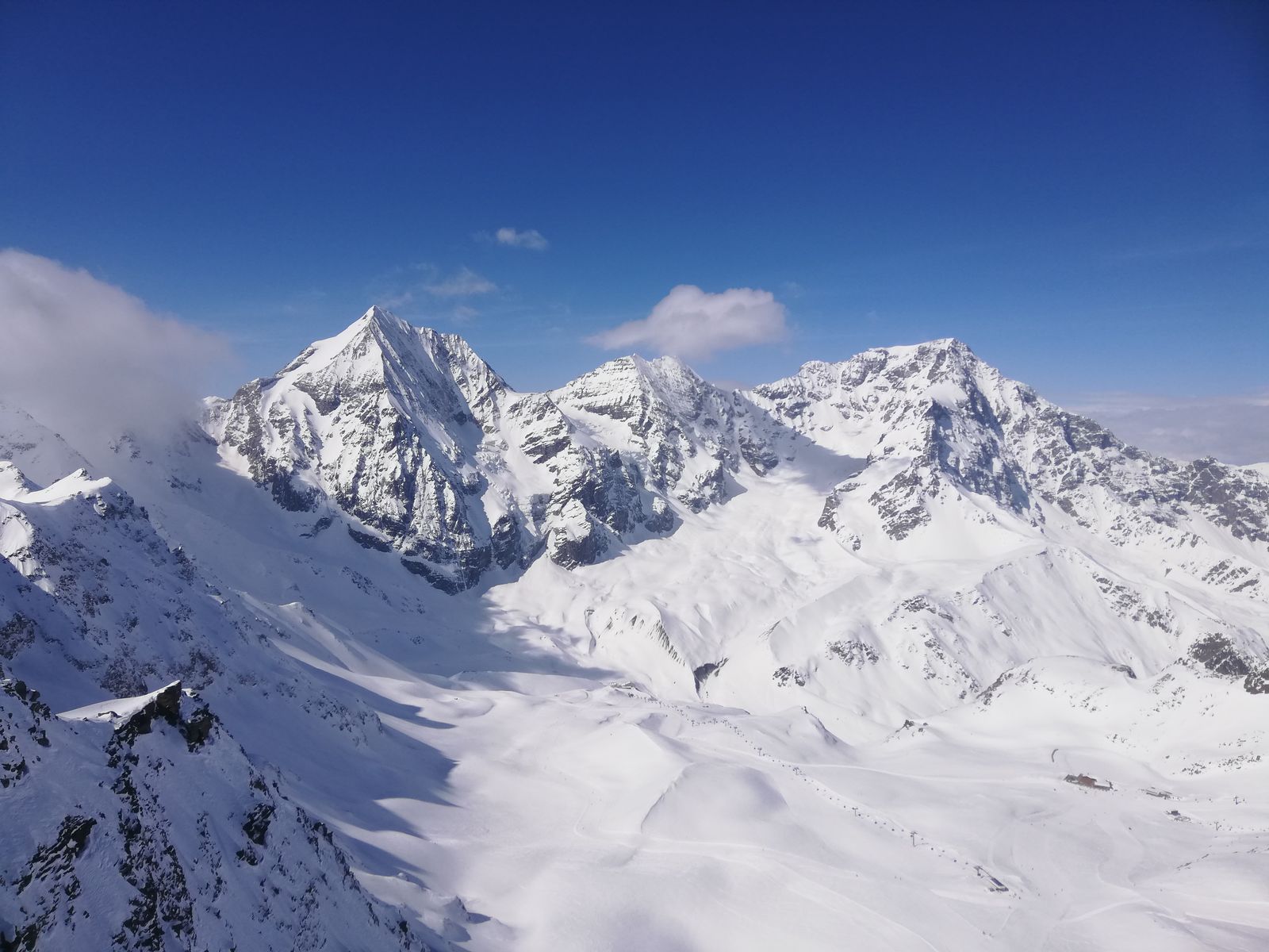 Abfahrt wie Aufstieg. Auf dem Gletscher gut fahrbarer, meist etwas gepresster Pulverschnee, unterhalb der Marteller Hütte harschig und pistenmäßig eingefahren.