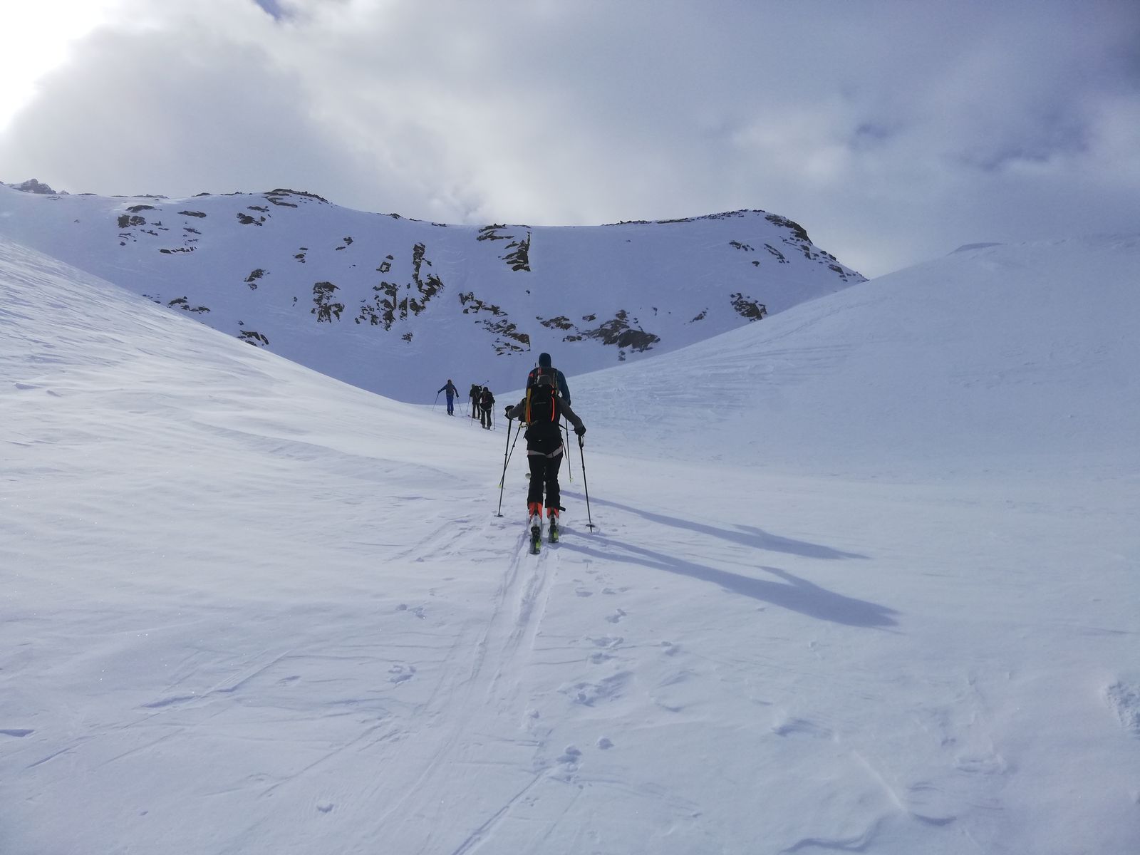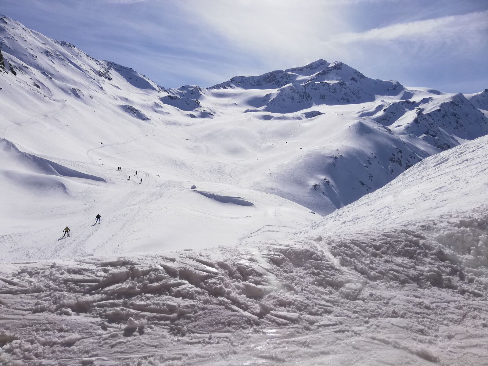 Samstag bei vormittags noch sonnigem Wetter durch das Butzental auf die Madritschspitze. Abfahrt zunächst über den Gipfelhang, ab Punkt 3040m über einen steilen Osthang ins Madritschtal hinab und durch dieses direkt zur Hütte zurück. Schnee im Gipfelhang griffiger Harsch, im Osthang gepresster Pulver.