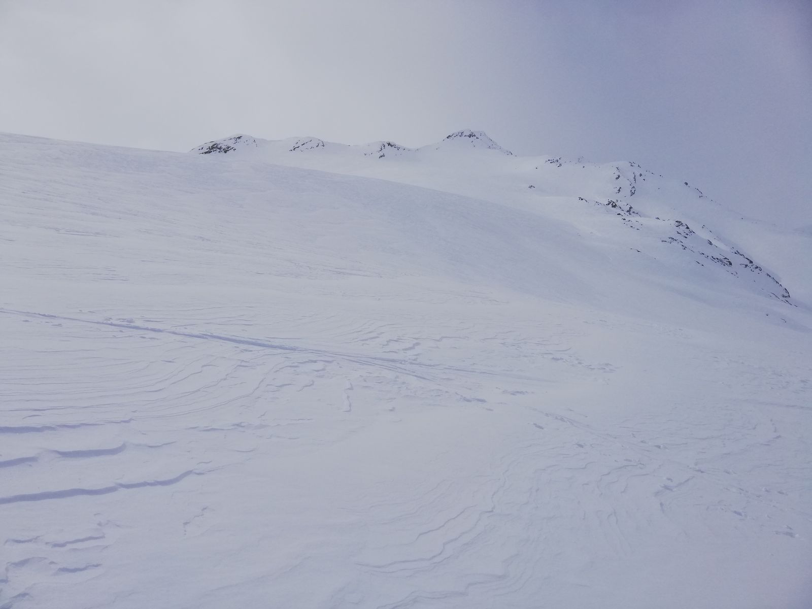 Sonntag bei Gipfeln in Wolken, immer wieder starkem Wind und deutlich gesunkenen Temperaturen um - 12 Grad in Gipfelhöhe auf die Dritte Veneziaspitze. Etwas verwickelt Route: Zunächst von der Hütte hinab zum Plimabach und über eine Hängebrücke über diesen. Nach Osten Richtung Vordere Rotspitze hoch bis ca. 2600m, dann Richtung Süden über einen Hang und anschließend durch eine breite Rinne östlich an der Schranspitze vorbei und über einen weiteren Steilhang auf die Endmoräne des Schranferners. Über diesen in einem großen Rechtsbogen in den Schneesattel unmittelbar östlich des Gipfels. Vom Sattel kurz und einfach zu Fuß zum höchsten Punkt. Abfahrt wie Aufstieg. Überwiegend mehr oder weniger gepresster Pulver, geringe Neuschneeauflage, etwas Triebschnee, meist gut zu fahren.