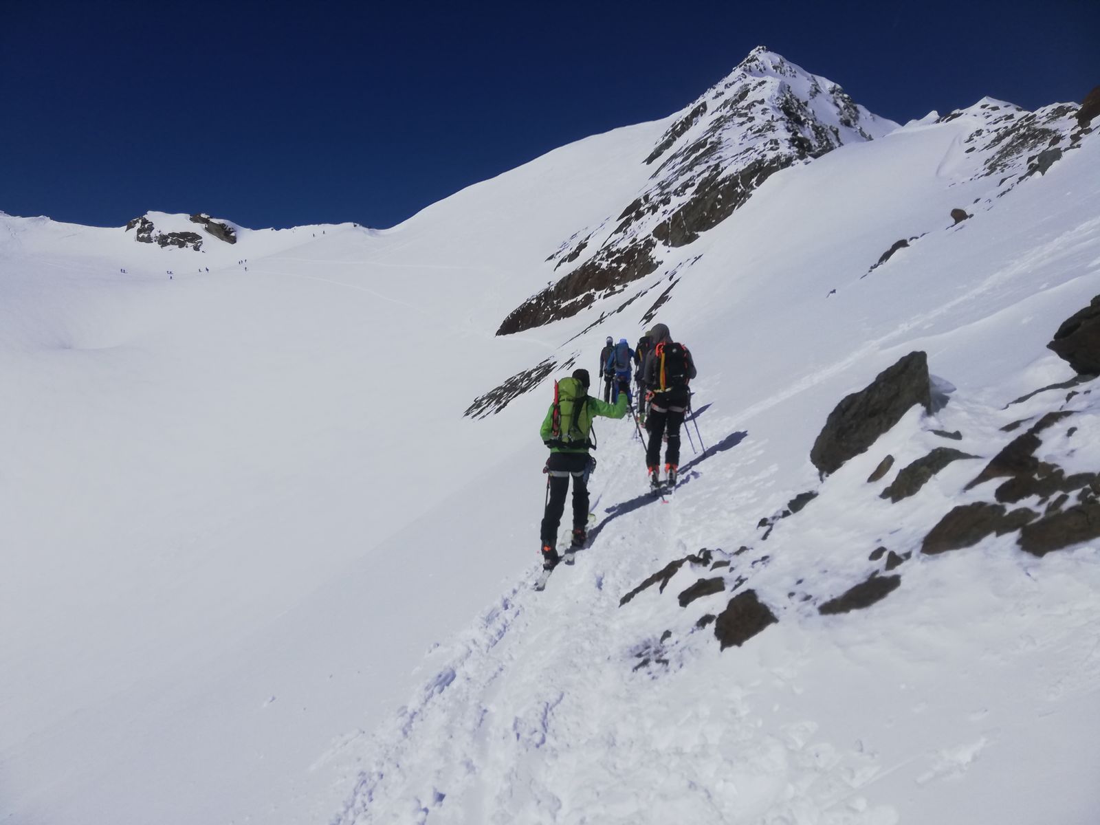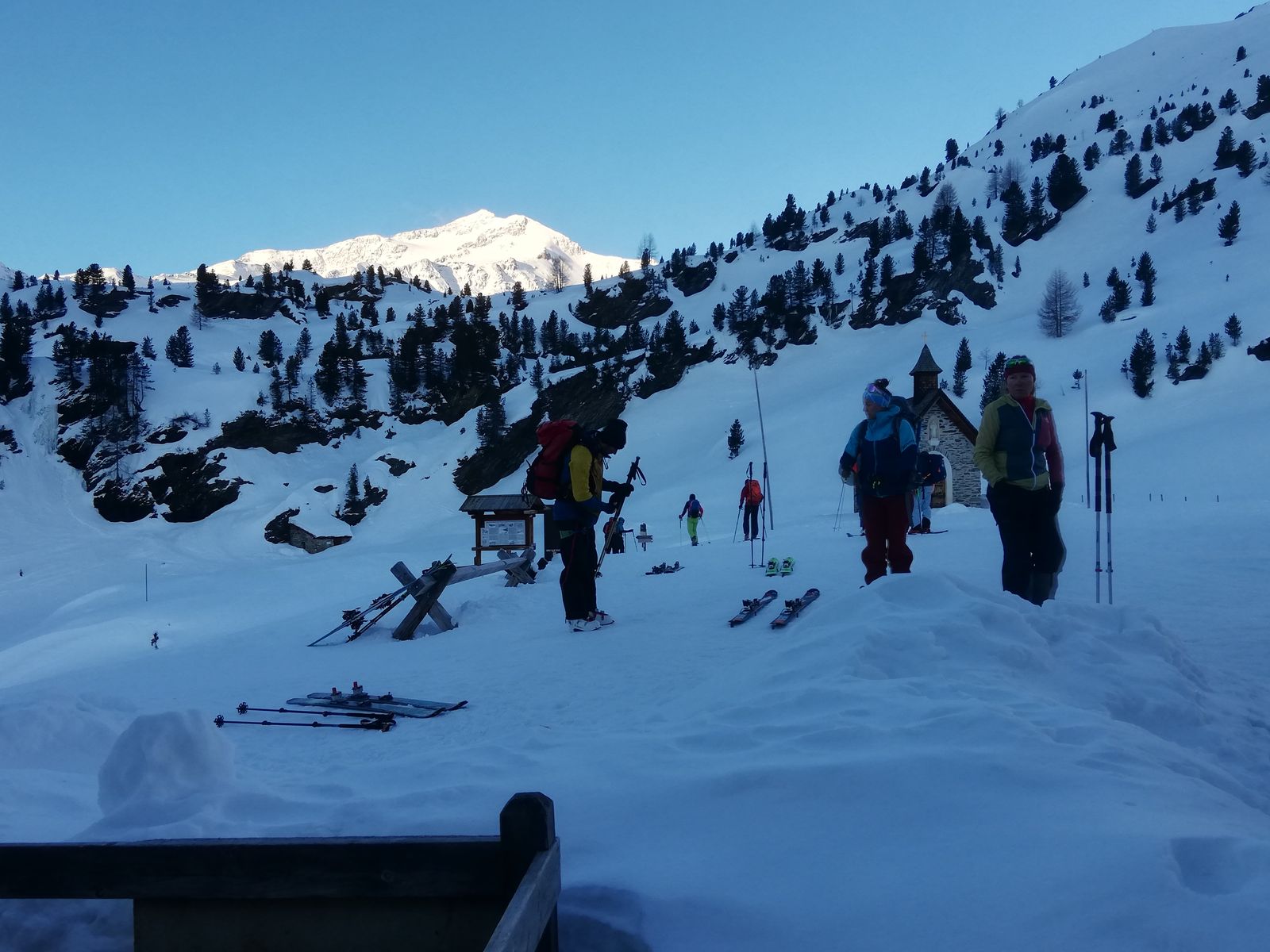 Am Montag bei sonnigem, aber kalten Wetter (-8 Grad morgens an der Hütte) von der Hütte Richtung Marteller Hütte und weiter über den Fürkeleferner (eher auf der linken Seite haltend) zum Fuß einer steilen Spaltenzone, an deren rechten Rand man hochsteigt und dann auf ca 3600m nach links flach in eine Schneeschulter im Ostgrat der Zufallspitze quert. Die Spalten zone scheint gut eingeschneit zu sein, auf dem Gletscher sind keine Spalten zu sehen. Ab dem Sattel zu Fuß, die Ski tragend, ein Stück den Ostgrat hoch (Steigeisen angenehm, aber nicht zwingend) und dann, sobald es möglich ist, wieder mit Ski den steilen Südhang der Zufallspitze in den Sattel südwestlich unter dem Gipfel queren. Vom Sattel zu Fuß, eventuell noch ein Stück mit Ski, den Rücken hoch und über die Gipfelfelsen zum höchsten Punkt. Man könnte auch ab der Schneeschulter den kompletten Grat zu Fuß bis zum Gipfel gehen.
