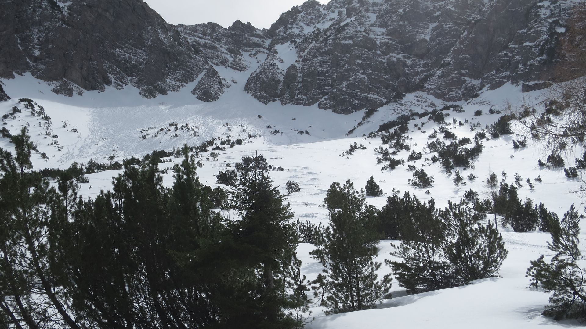 Nochmals angefellt und in Aufstiegsrichtung ins linke Westkar hoch bis zur beginnenden Verengung bei ca. 1640m. Die bis dahin makellose Schneeoberfläche wurde in wenigen Minuten durch zahlreiche, von oben aus der Rinne kommenden Neuschneeboller gespickt, so dass es höchste Zeit für die Abfahrt wurde. Sehr schöner, wenn auch etwas schwer zu fahrender Schnee.