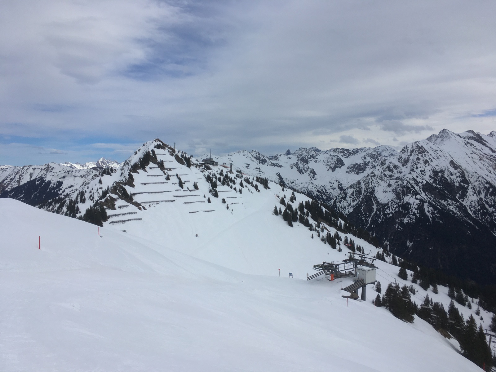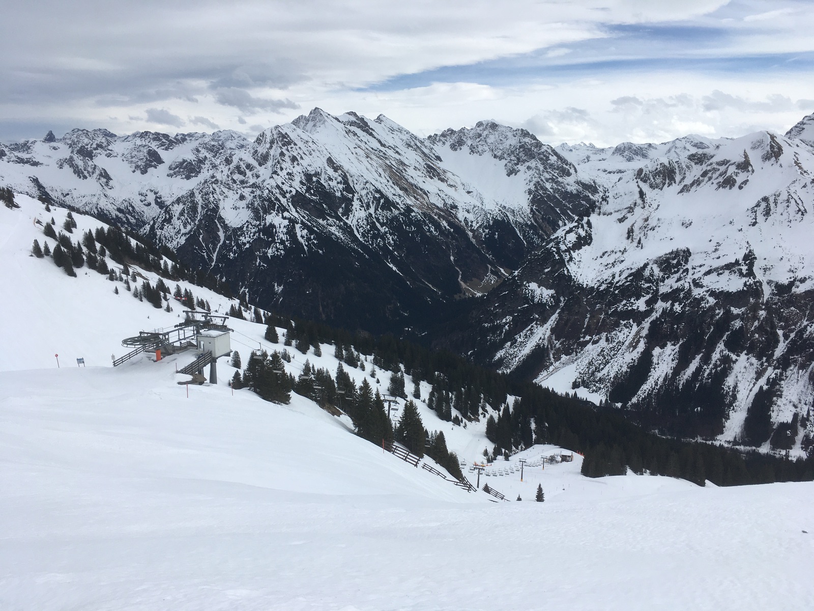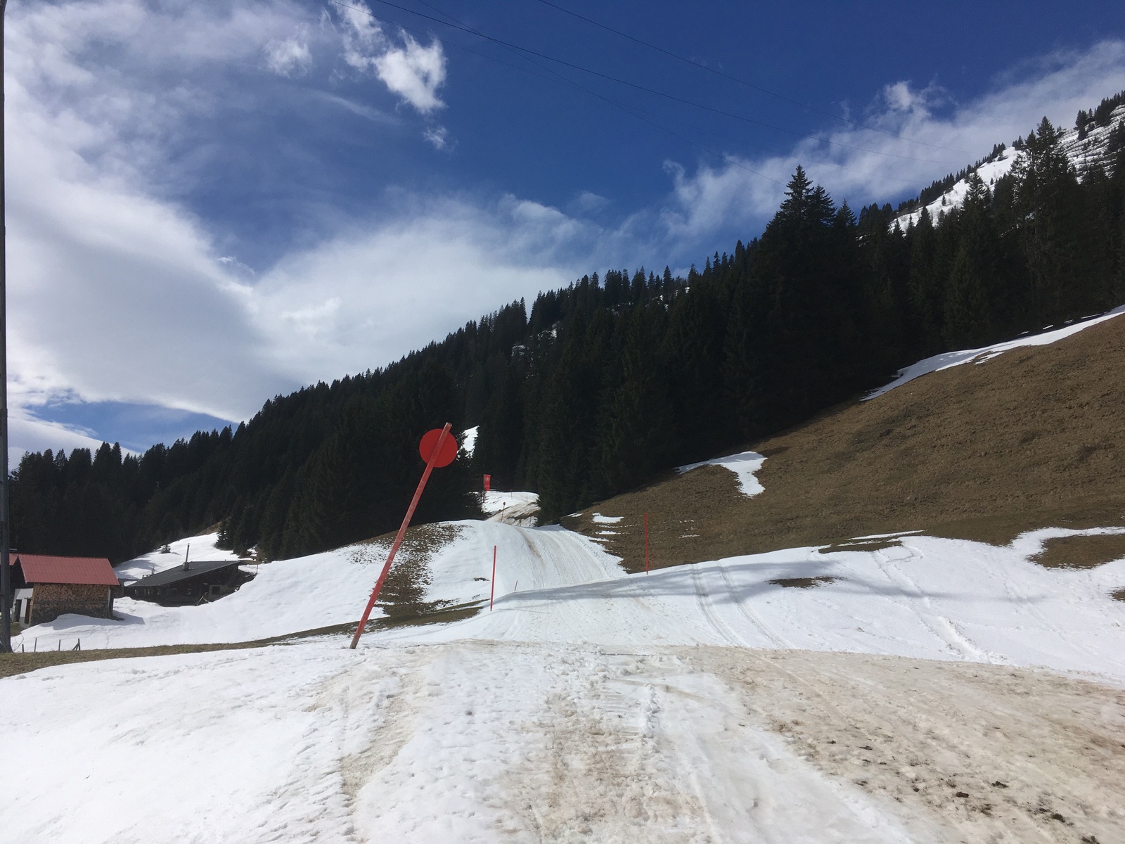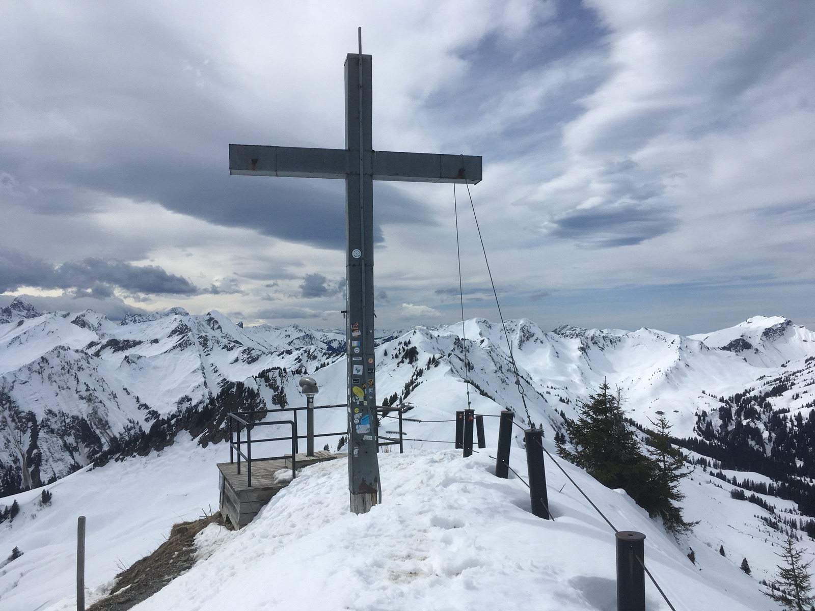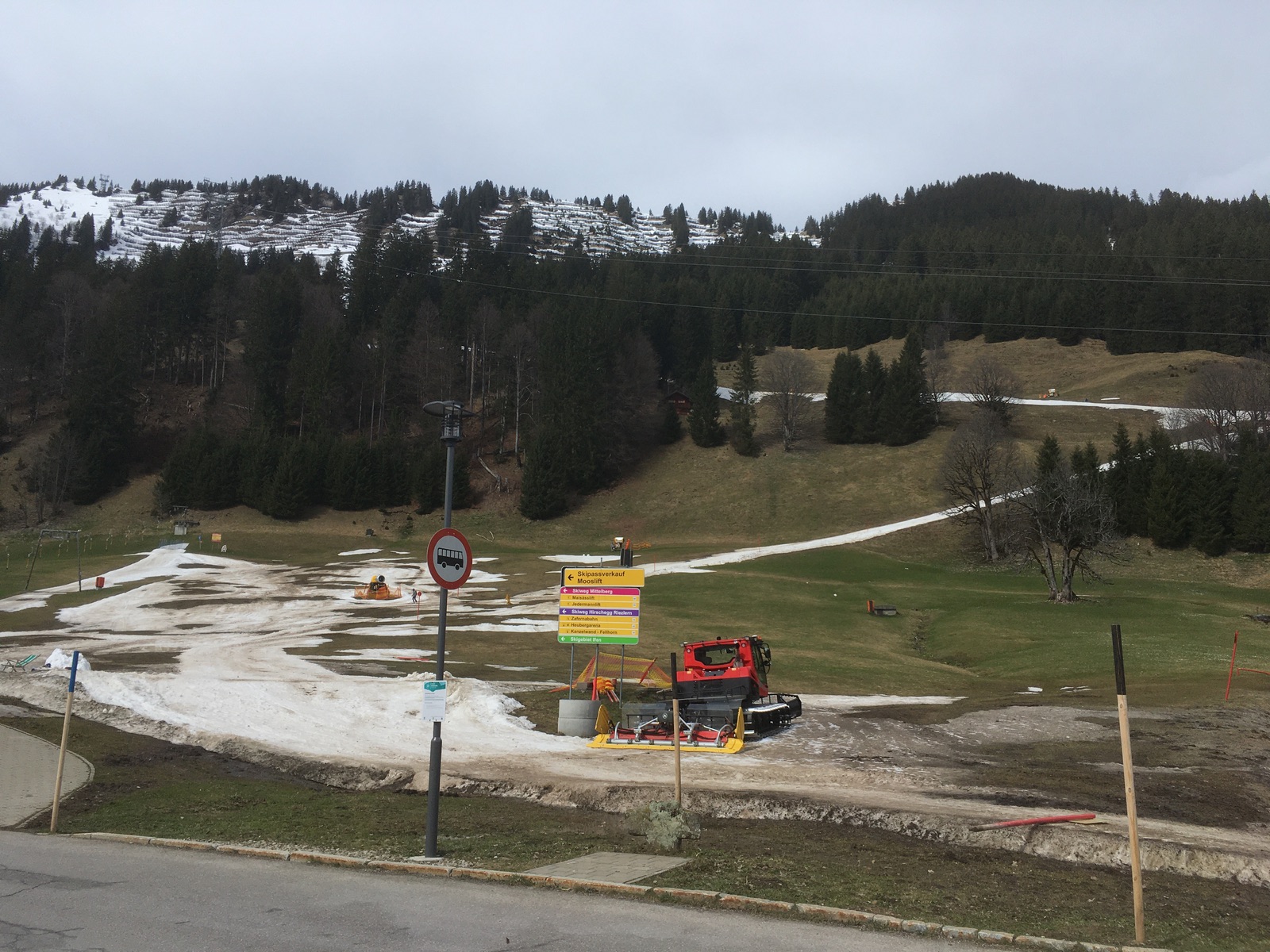 Zu meiner Überraschung waren gestern die Bergbahnen im Kleinwalsertal bis auf wenige Ausnahmen aufgrund des Sturms geschlossen, so dass ich auf meinem Weg über die Piste bis zum Gipfel nur ein paar wenige Skitourengeher, Rodler und Winterwanderer traf. Die Talabfahrt war scheinbar bis Mittwoch "offiziell" geöffnet, ist aber zwischenzeitlich schon stark ausgeapert (kein Wunder bei 25 Grad gestern). Am Vormittag ging es noch durchgehend, bei der Abfahrt gab es schon Lücken. Weiter oben (ab der Querung) liegt mehr Schnee, im Kessel oben noch richtig viel Schnee. Es geht problemlos mit Skiern bis zum Gipfelkreuz. Der Muttelberg bis oberhalb der Liftstation ist ebenfalls kein Problem.