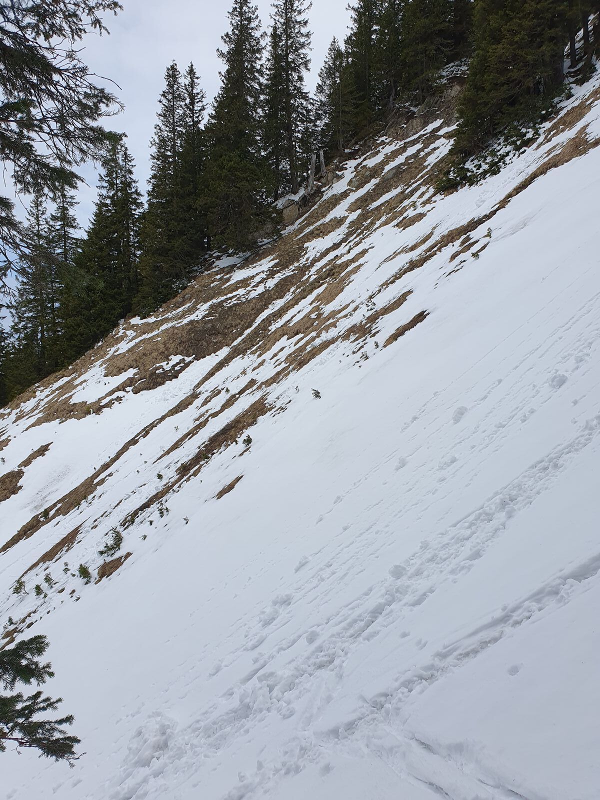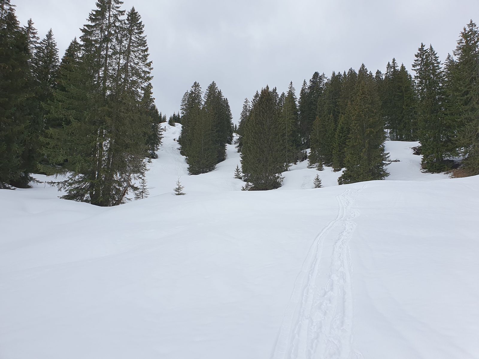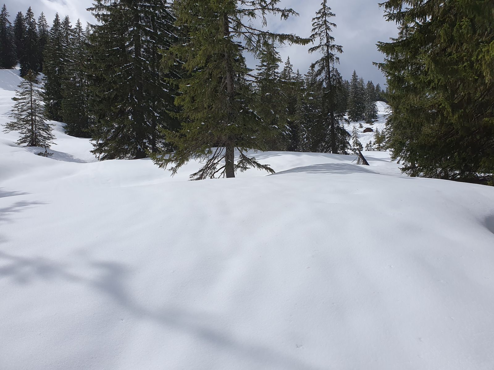 Man merkt natürlich schon, dass im dichteren Wald der Schnee wenig wird bis grün. Um so beruhigender die Schneehöhen, die man dann in der Nähe eingeschneiter Einzelbäume sieht.