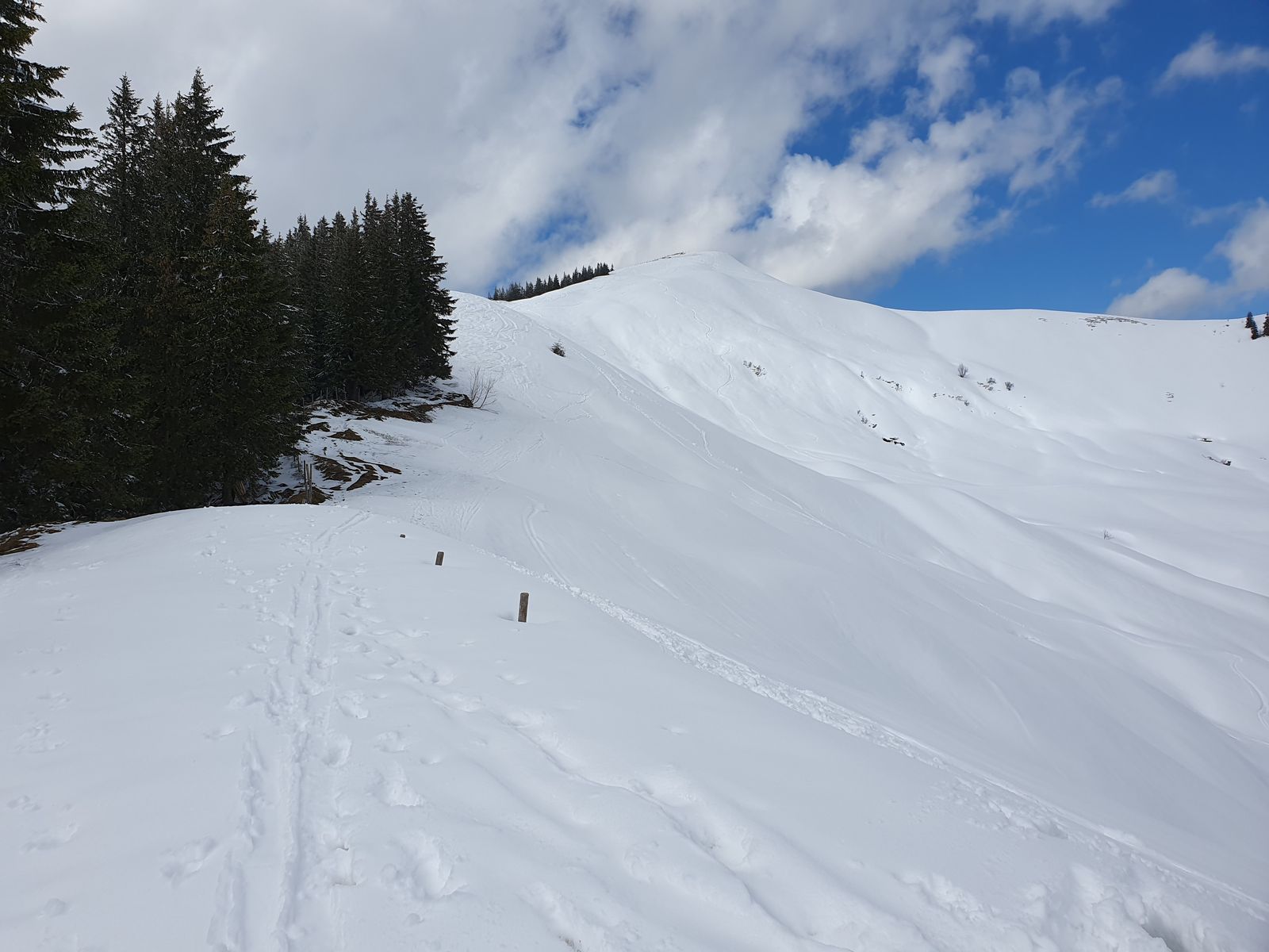 Der Schnee war am Nachmittag (ich konnte leider nicht anders) allerdings Bremsschnee. Im Aufstieg bequem, in der Abfahrt suboptimal.