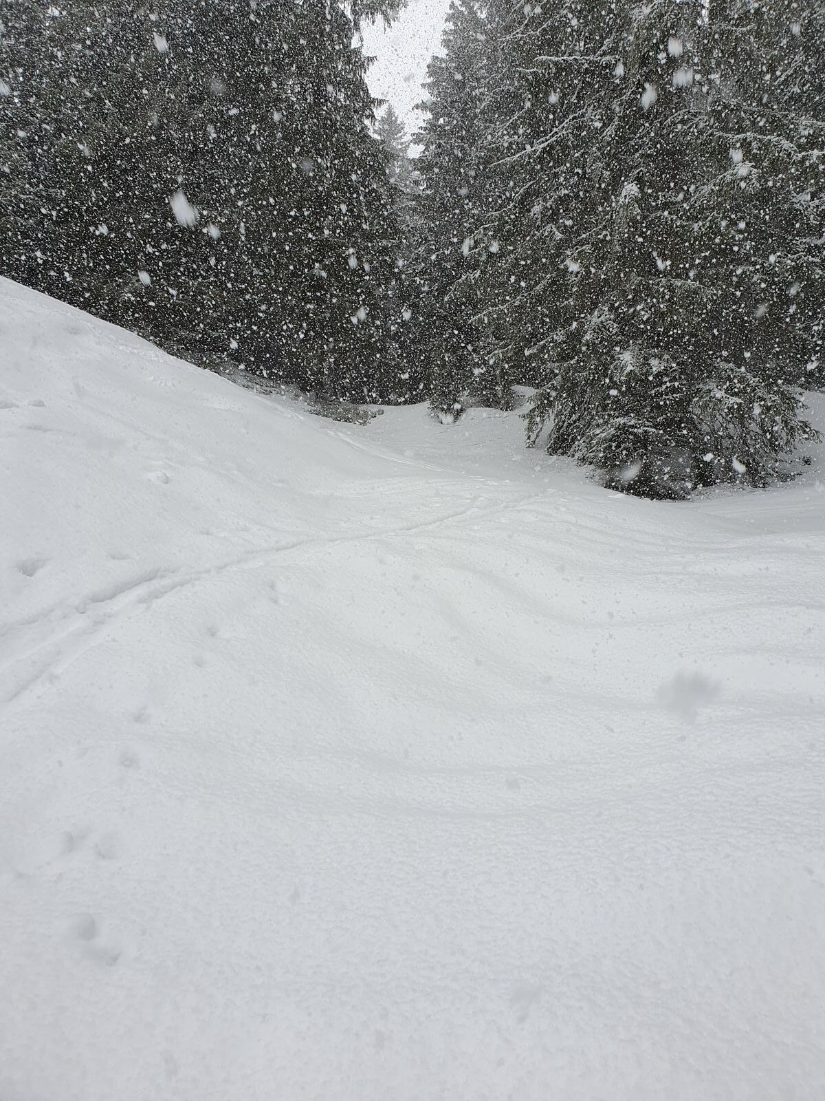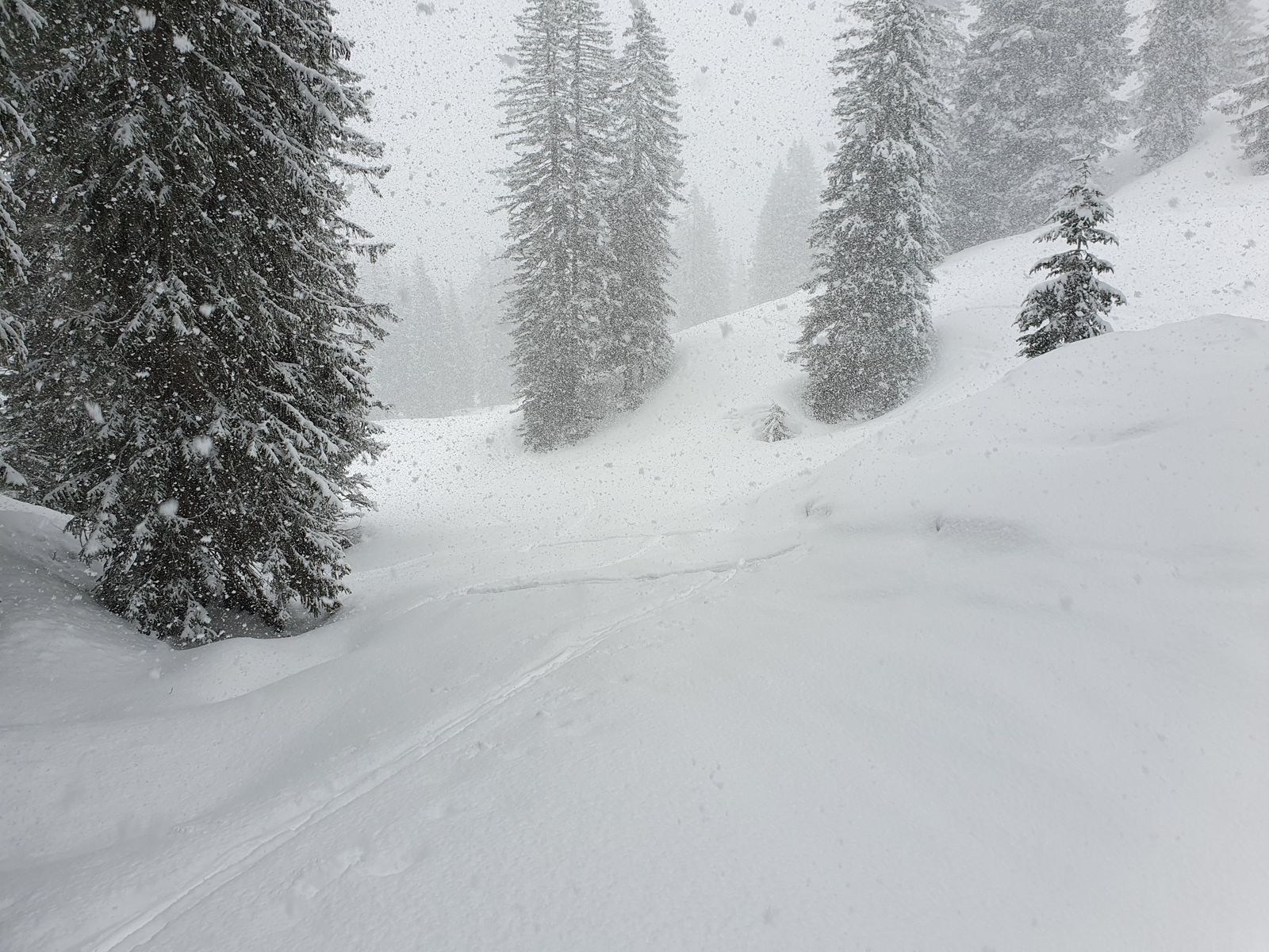 8:(Do, 28.3.24): noch waagerechter Schneefall in windgeschützer Schneise