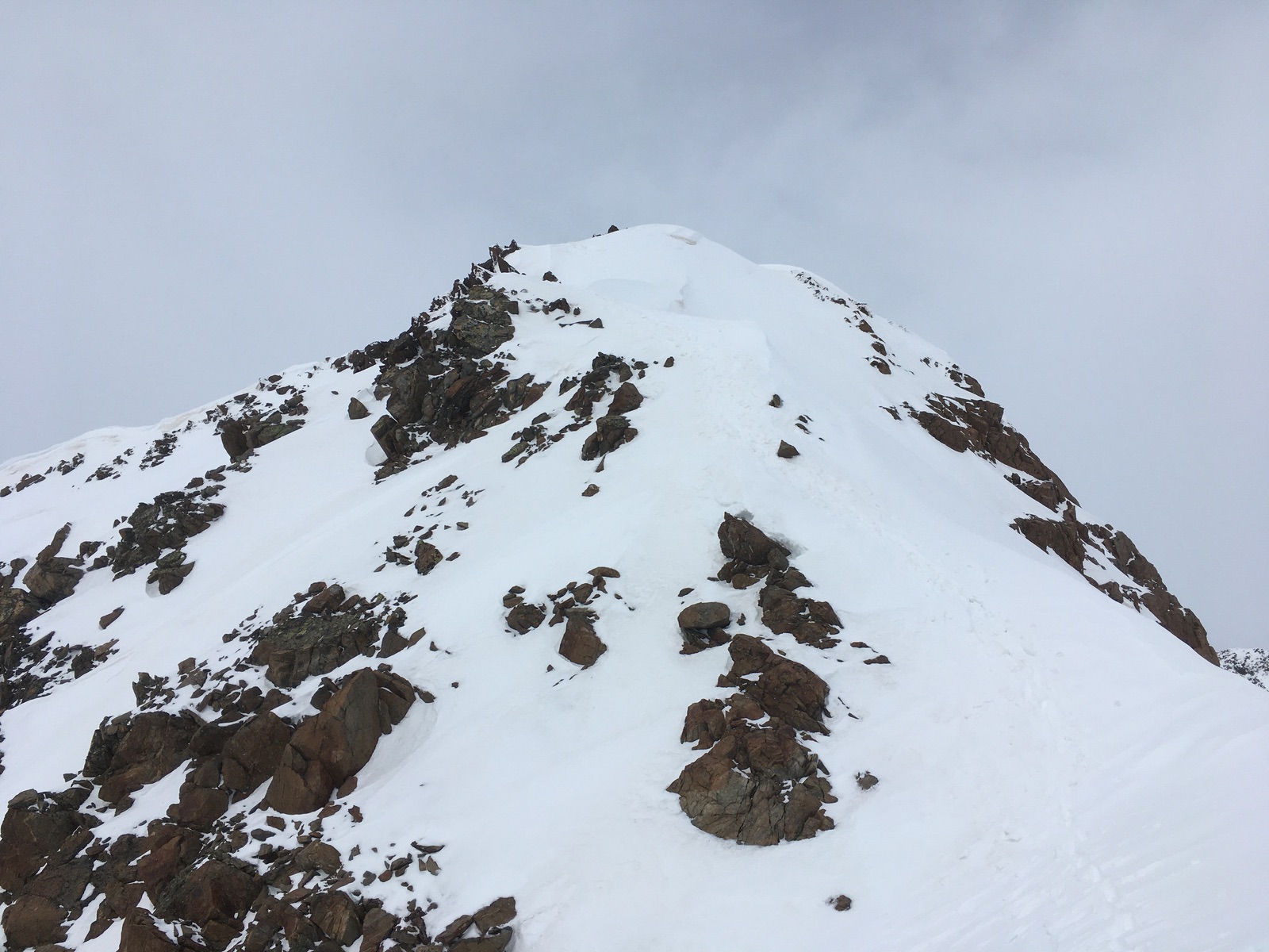 Ab der Martin-Busch-Hütte zum Gipfel gab es nur anfangs eine Spur, dann musste ich alles selber spuren. Die Spuranlage ist aber nicht ganz optimal, bin etwas zu hoch gekommen. Allgemein sah man - siehe oben zum Andrang - im Gebiet bisher nur wenige Spuren. Die letzten ca. 40 Hm zum kreuzlosen Gipfel bin ich hochgestapft - ein Pickel ist nicht schlecht, u.U. kann man auch Leichtsteigeisen gebrauchen.