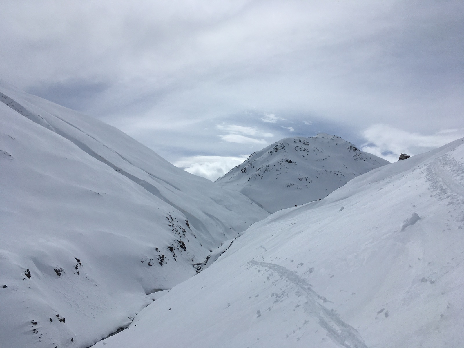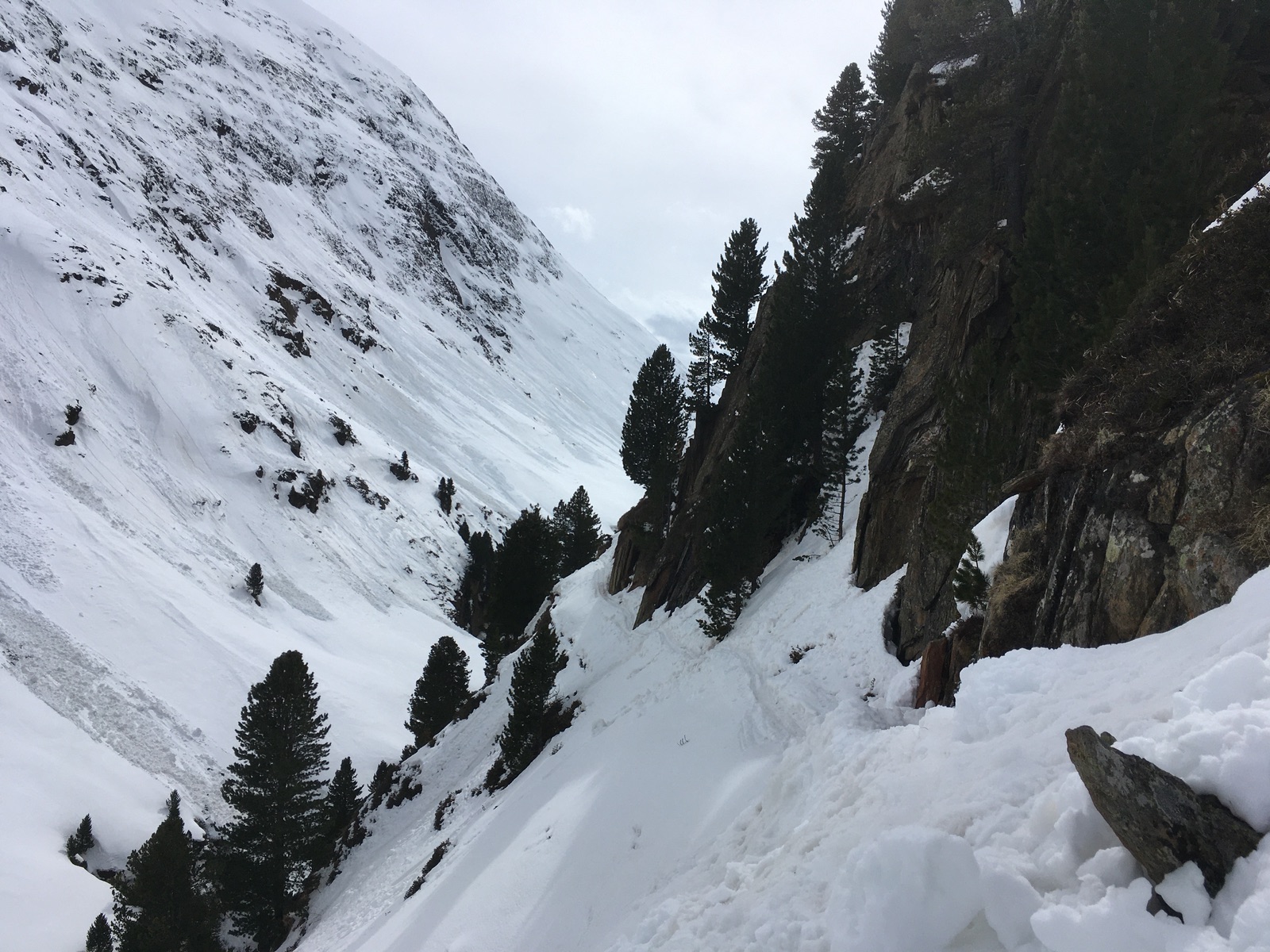 Die Rückkehr nach Vent durch bzw. oberhalb der Rofenschlucht war heute eher unangenehm. Die Südhänge haben im Bereich der Skispur und v.a. des Steiges oberhalb der Schlucht teilweise wenig Schnee - Gefahr von Steinkontakt. Der Schluchtsteig weist eine gute Skispur auf, es geht aber nervig auf und ab und das über längere Zeit auch sehr ausgesetzt und zum Teil bedroht von Lawinen und Steinschlag. Da ist man froh darum, bei der Materialstation der Vernagthütten-Seilbahn anzukommen. Allgemein empfehle ich, die Schlucht trotz der ausgesetzten Stellen mit Skiern zu machen (vielleicht auffellen für die Gegenanstiege). Zu Fuß ist sicher nicht besser (und wäre unfair, wenn die gute Skispur zertrampelt wird), höchstens falls es am Morgen extrem hart gefroren ist. Der restliche Weg nach Rofen und dann zurück nach Vent erfordert am Nachmittag erst recht mit schlecht laufenden Skiern viel anschieben / haxeln.