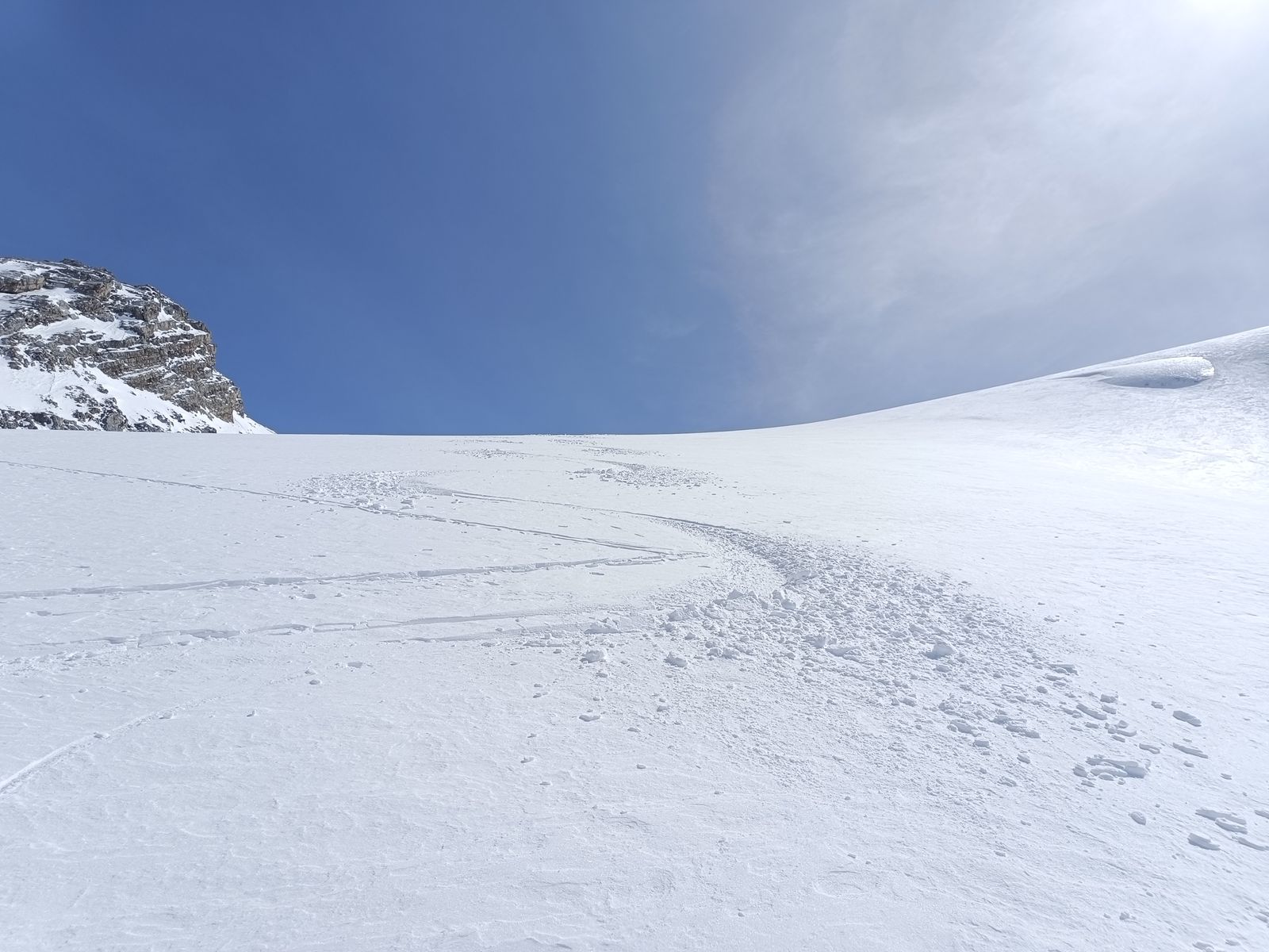 Ohje! Der Schnee ist harschig, trägt aber nicht. Das wäre jetzt ein Moment gewesen, wo man durchaus umdrehen hätte können. Aber was dann? Glei zum Wirt? Na, da probier ich es doch lieber noch ein bisserl. Und tatsächlich: Nach 300 Hm (auf ca. 2200m) trägt der Schnee, auch dank a Lawinenschnees. Ich habe mich im unteren Teil weit links entlang des gewaltigen Felskolosses gehalten, was kürzer ist als die übliche Route, aber nur gemacht werden sollte, wenn die Felsen schon vom Schnee entladen sind wie heute (siehe Bilder). Am Gletscher war ich froh, dass der Pulver ziemlich windgepresst war, da dies das Spuren sehr erleichterte. In der Abfahrt dennoch herrlich! Bis 2200 Meter Pulver und dann gut fahrbarer Sulz.
