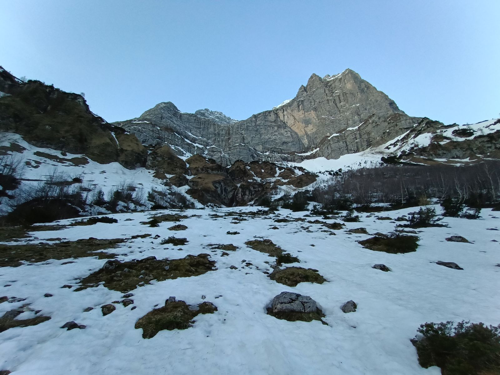 Start um 5 bei Plus-Temperaturen an der Mautstelle, eine Stunde hinter geradelt, dann 10 Minuten die Ski tragen über Krokuswiesen bis zu den ersten Schneefeldern. Auf zunehmend durchgefrorenem Schnee hinauf zur Scharte, Harscheisen sind nicht zwingend nötig, aber im oberen Drittel angenehm. Um 10 Uhr Abfahrt über meist sehr schöne Firnhänge, oben sogar noch Pulver Reste, unten sulzig. Bei den Eng Almen T-Shirt Wetter und massenhaft Radler unterwegs.