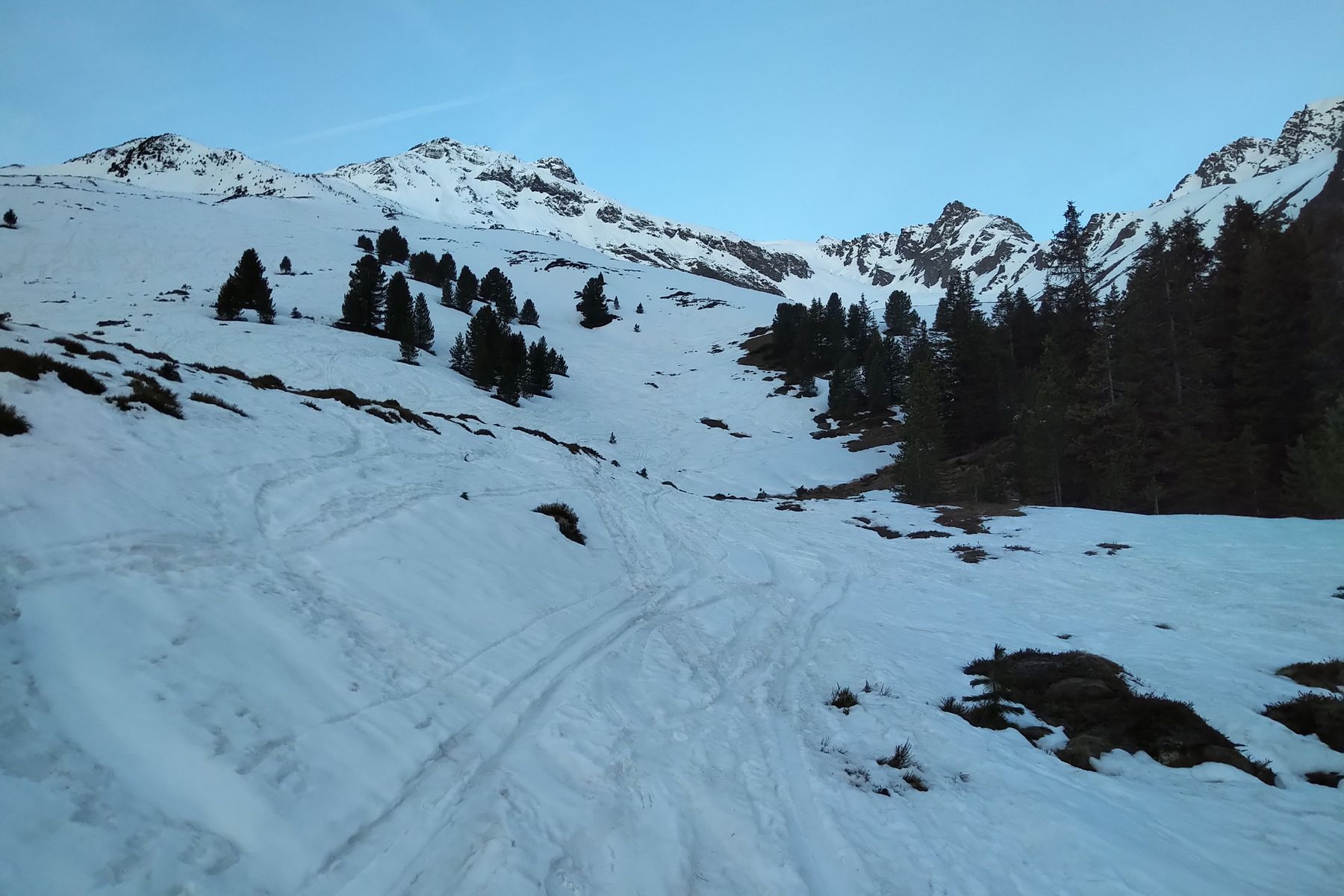 Der Zischgeles gehört jedenfalls aktuell dazu! Nach ungefähr 15 Minuten kann man schon die Ski anschnallen. Es sind zwar keine traumhaften Schneeverhältnisse, aber durchaus ordentlich und man kann fast ohne Unterbrechungen zum Skidepot aufsteigen.