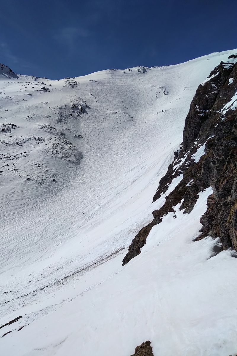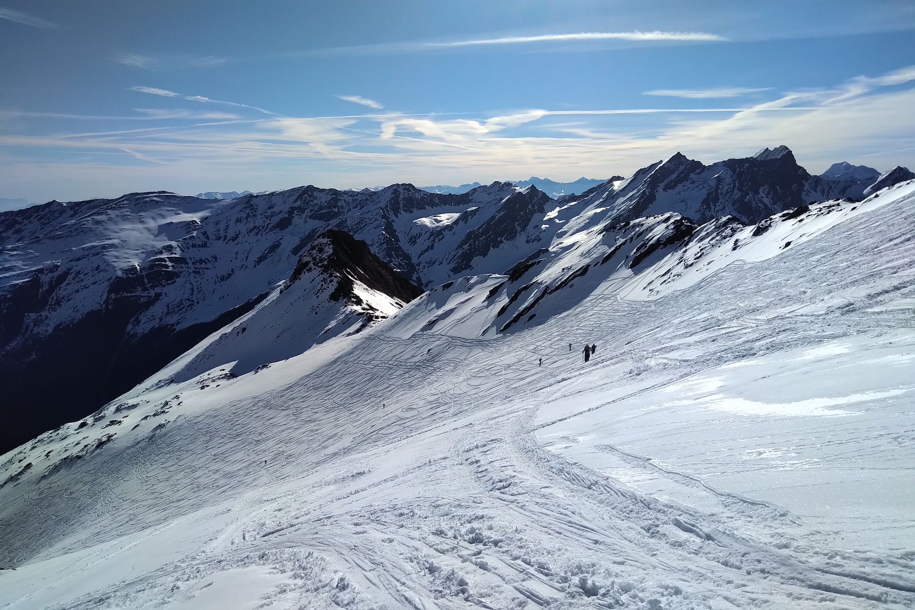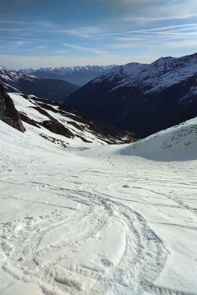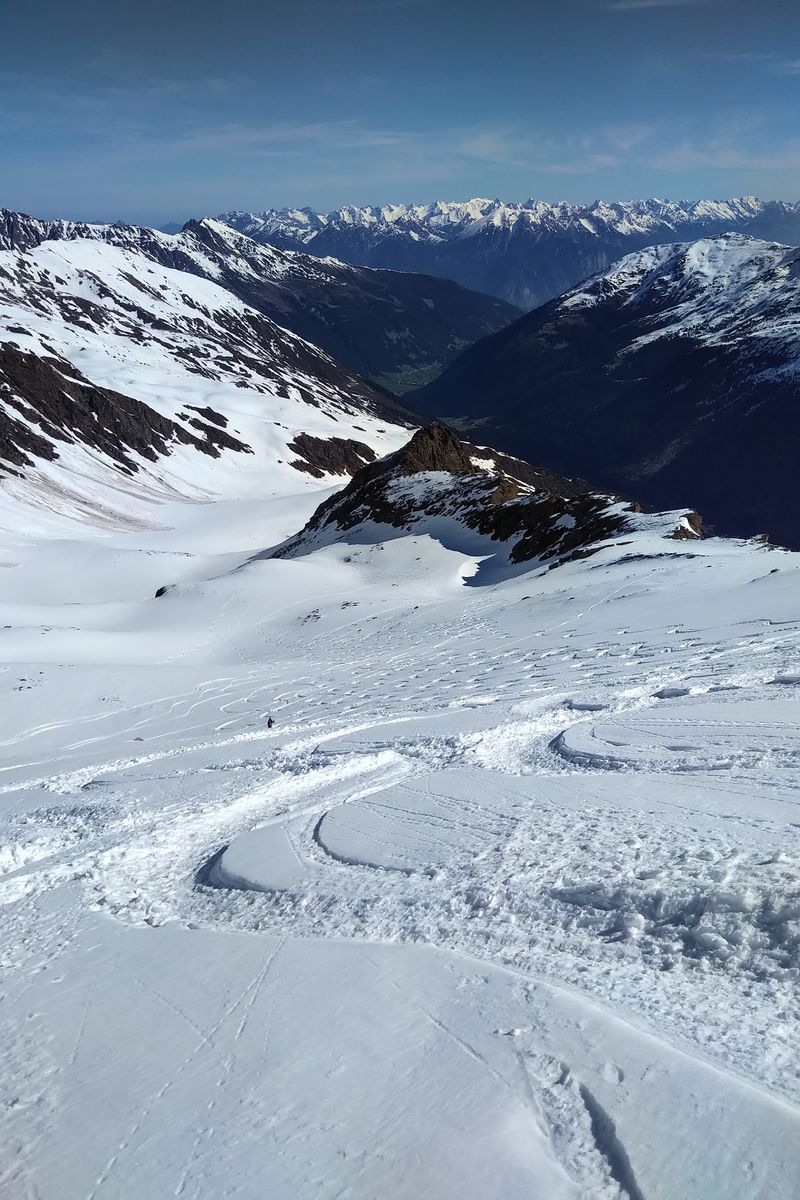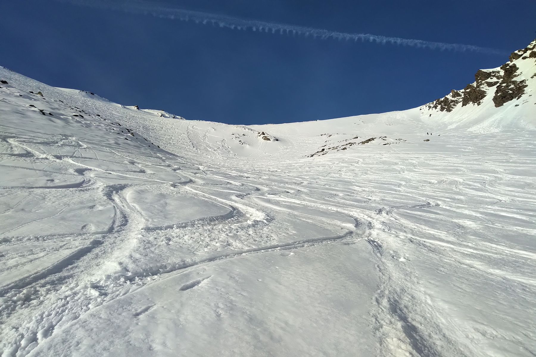 Die Abfahrts-Spuren vom Vortag sehen natürlich verlockend aus, aber ganz so gut war's hier wahrscheinlich heute nicht mehr (wir sind weiter hinten nach Norden ins Sattelloch abgefahren):
