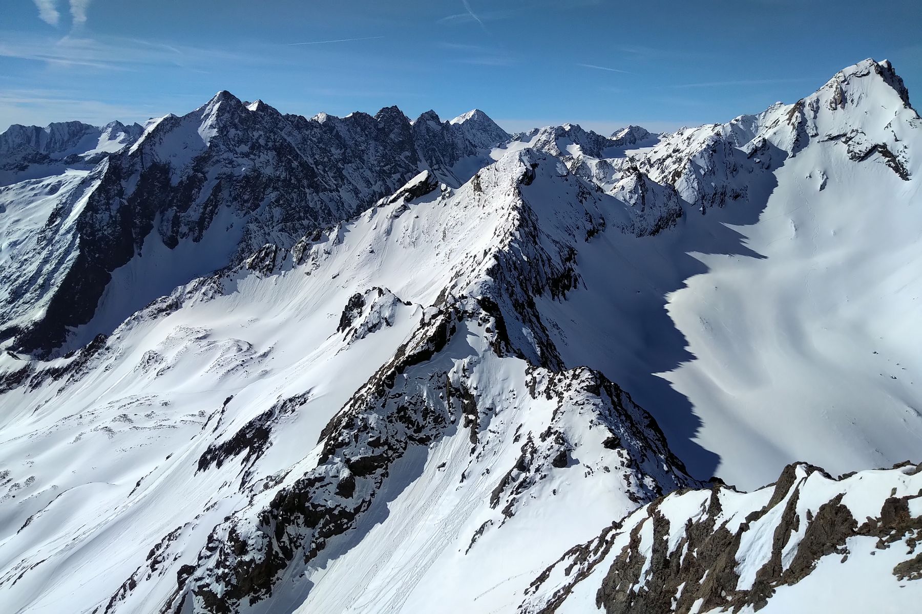 Blick vom Gipfel zum Lüsenser Fernerkogel, Schöntalspitze und Grubenwand. Die Schöntalspitze (in der Mitte) sah auch nicht schlecht aus, bis auf den Gipfelbereich: