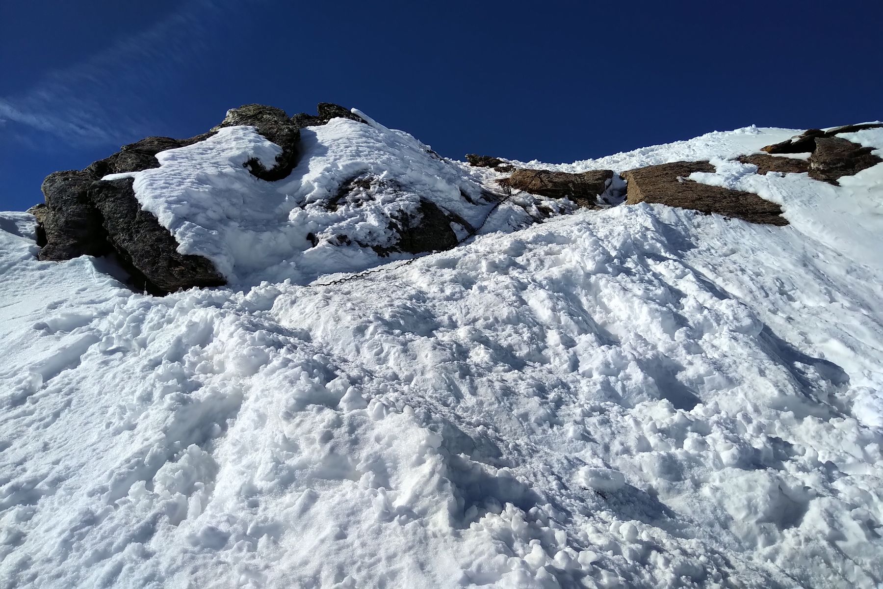 Durch Ketten entschärfte Schlüsselstelle beim Gipfelaufstieg: