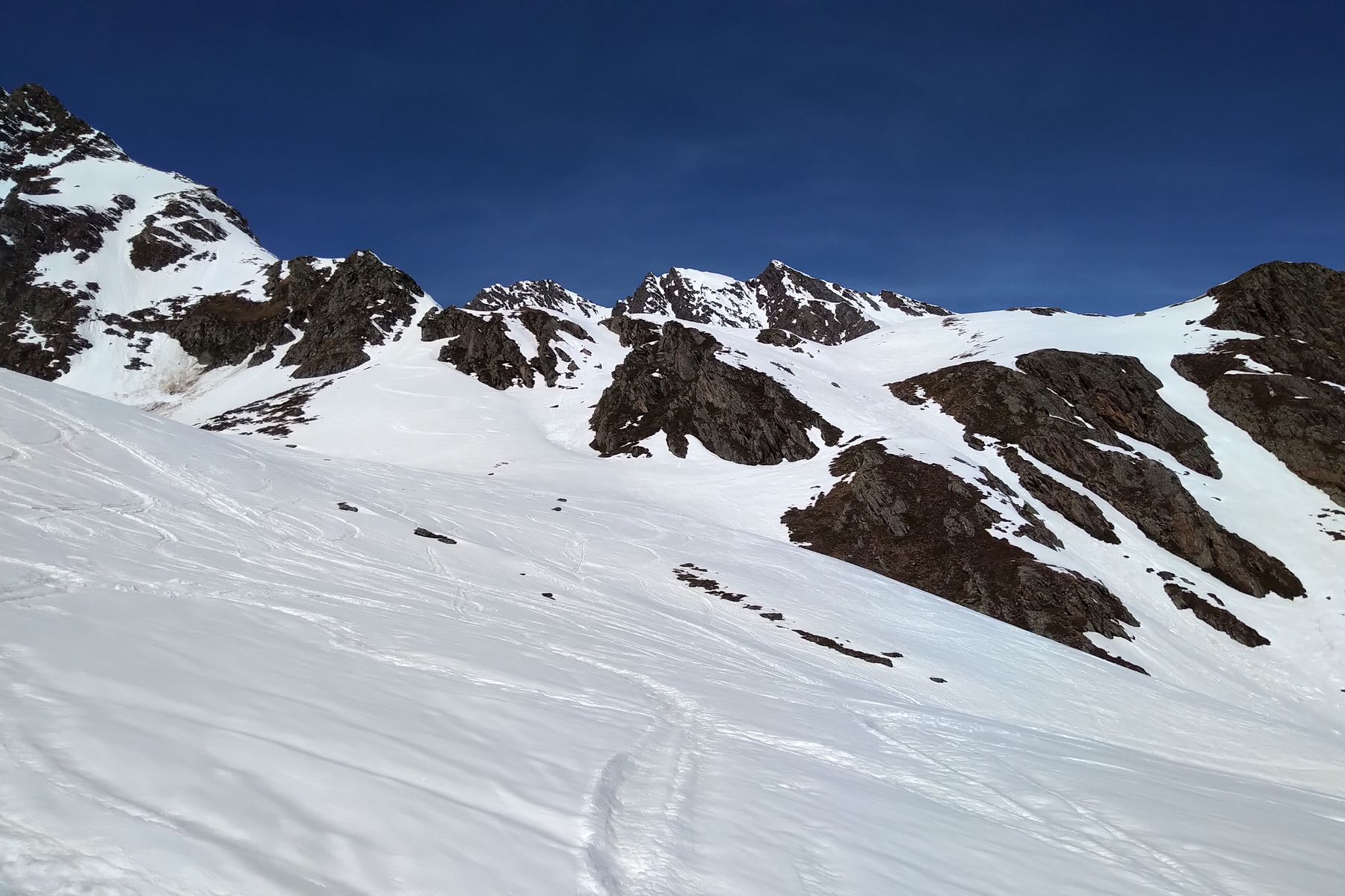 Beim Durchschlupf zwischen Sattelloch und Kamplloch wird's langsam eng mit dem Schnee. Das Kamplloch hat von der Ferne auch ok ausgeschaut von der Abfahrt. Ich hab aber mit niemandem gesprochen, der die andere Abfahrt gefahren ist und kann daher schwer beurteilen, welche heute die bessere war.
