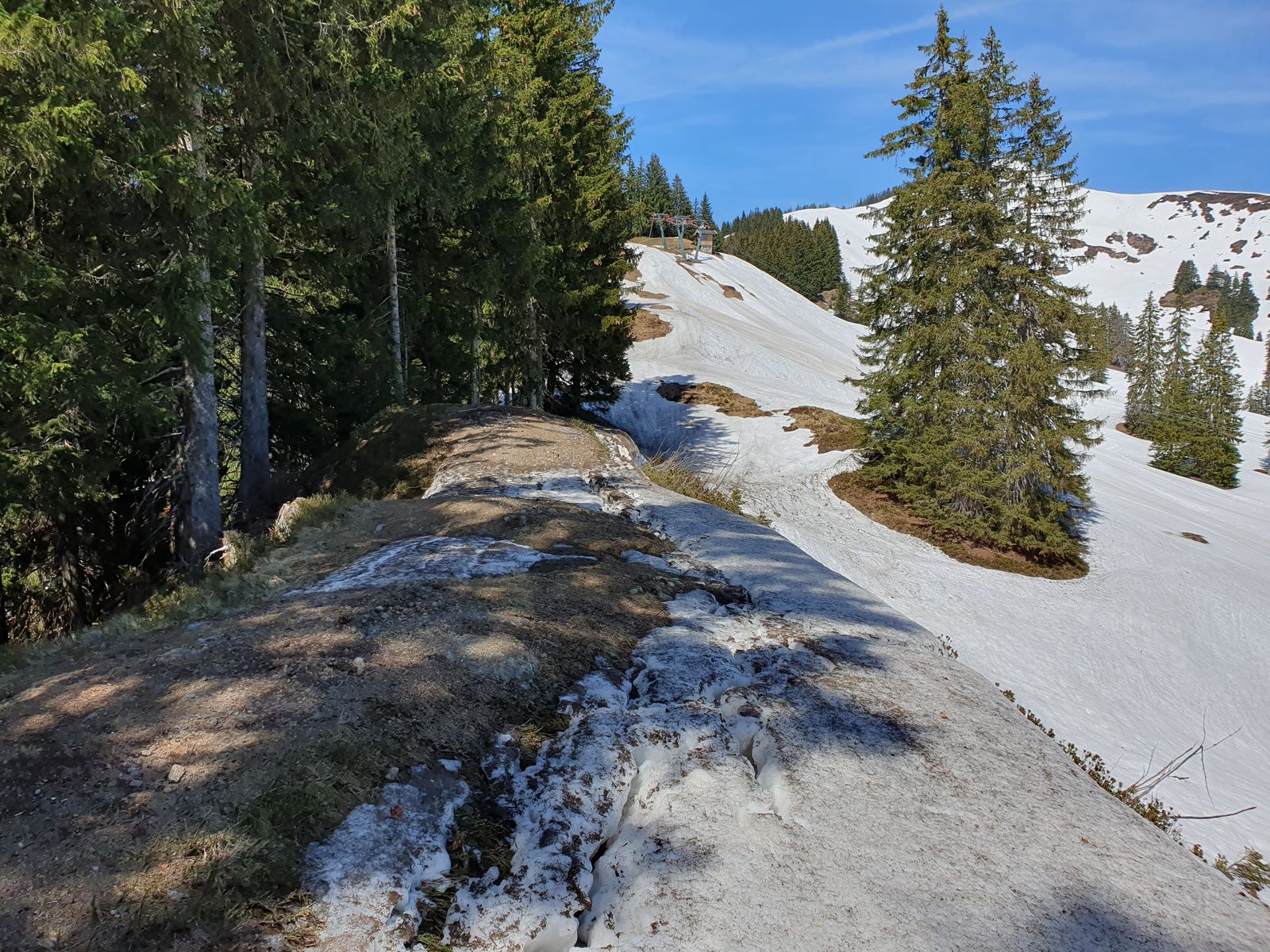 Schneelage + Qualität: erstaunlich gut, es gab bei der Skipiste zum Bolgen eine apere Stelle, die aber sicher So-abend größer wird, und die Waldschneise (die erste ab Lifttalstation, d.h. nach ca. 100m) ist auch für Aufstieg nur brauchbar, wenn man ohne Abschnallen auch nasse Felle in Kauf nimmt. Aktuell sind es nur 2 kürzere grüne Lücken(je ca. 5m).