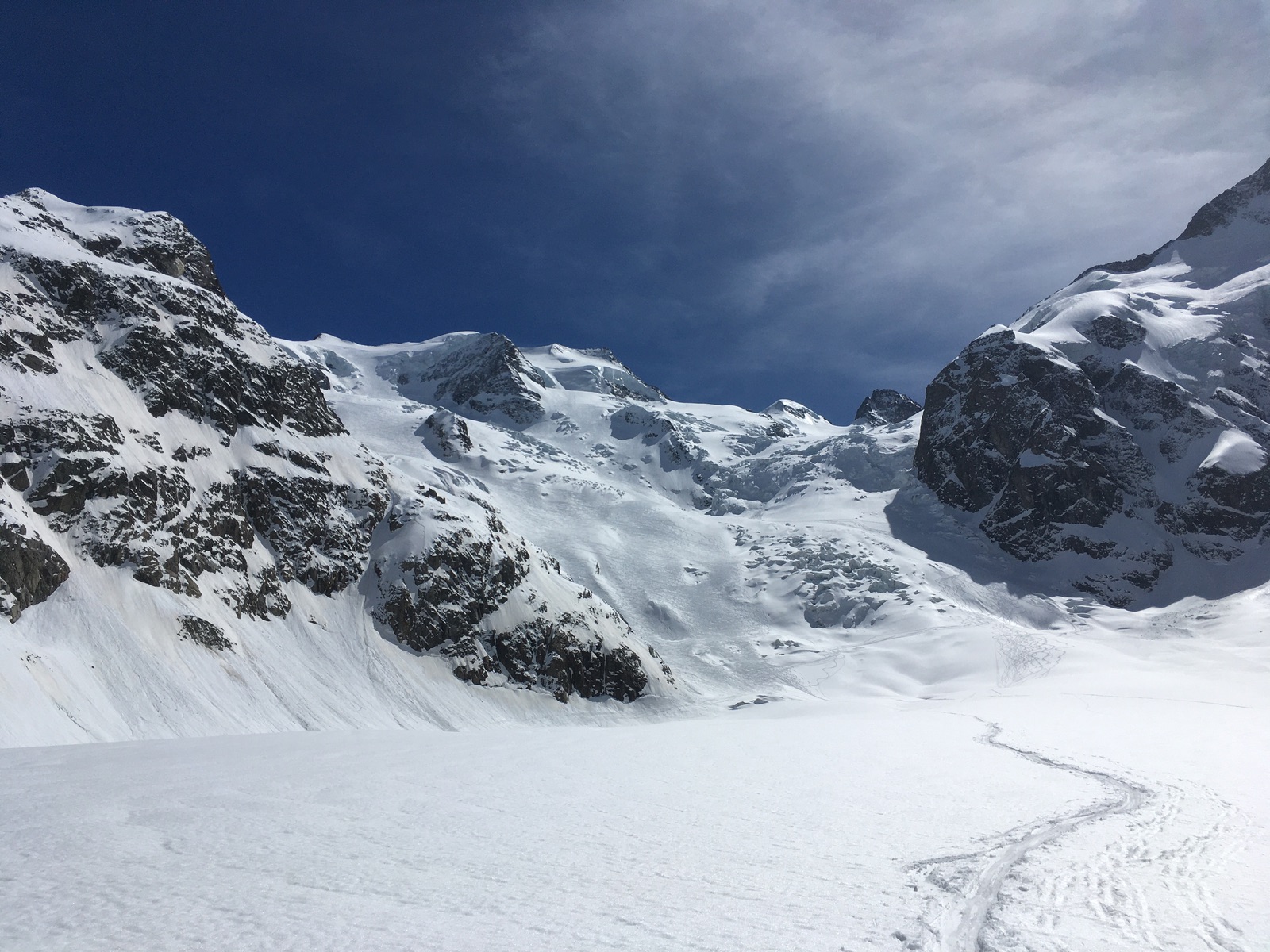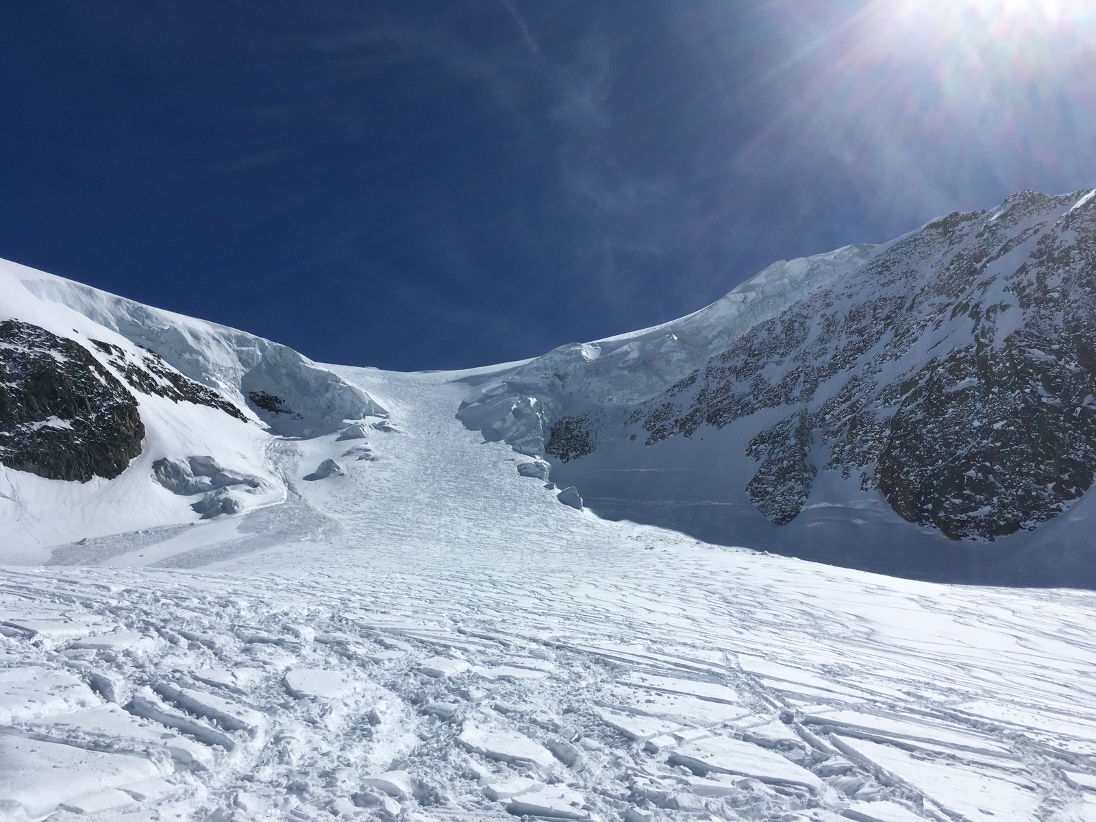 Beim Aufstieg oberhalb des Cambrena-Eisbruches - im Joch in Bildmitte ist das Skidepot: