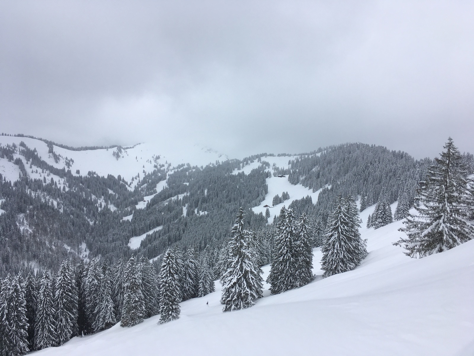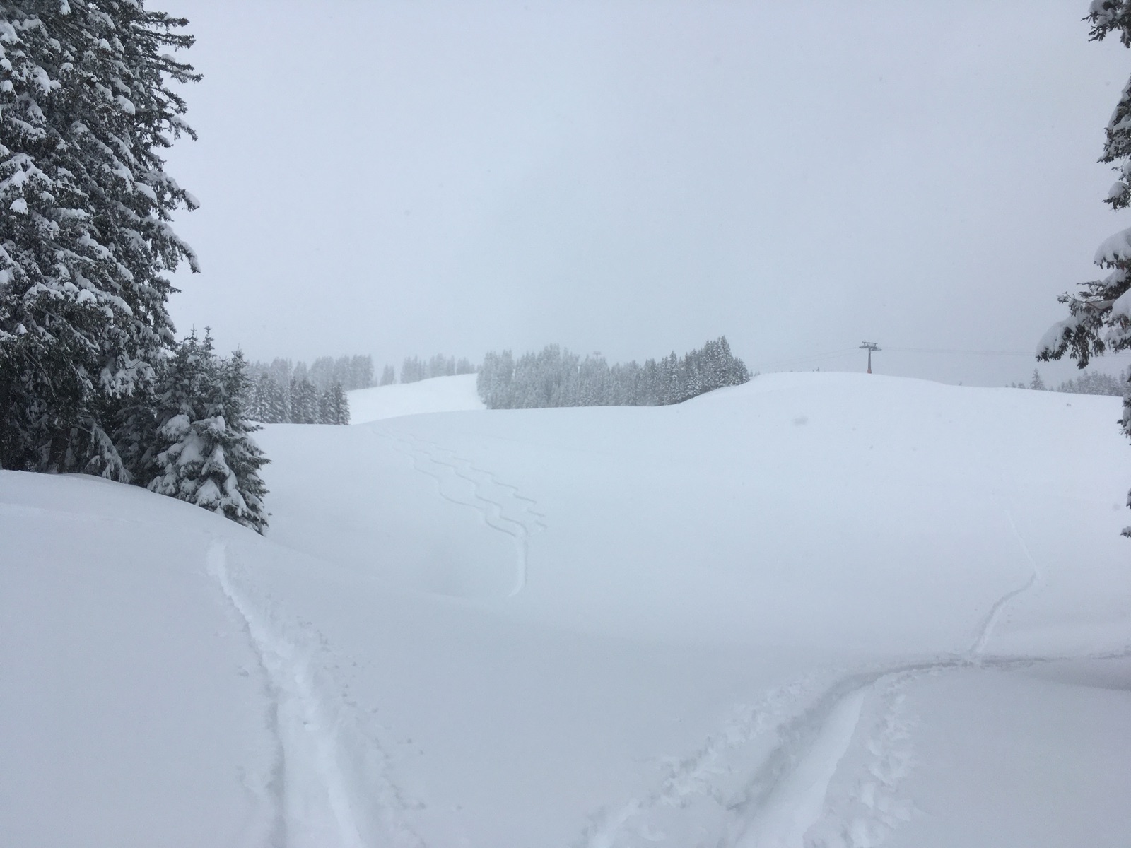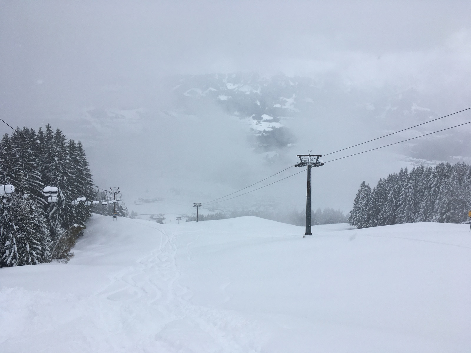 Für die Abfahrt braucht man auch Hänge von mindestens 30 Grad Hangneigung, sonst geht es nur in der Spur bzw. mittlerweile vorhandenen Abfahrtsspuren. Zweiter Aufstieg zur Bergstation der Hörnerbahn, hier ist es aber recht flach bzw. gab es noch keine Spur im direkten Abfahrtshang. Gegen Mittag lichtete es sich kurz und man sah die Sonne - gut für die Sicht, schlecht für den Schnee, gerade auch wegen diffuser Strahlung. Unten war der Schnee auch schon etwas schwer geworden. Es ging aber noch bis zur Bushaltestelle (beim Dorflift auch kostenpflichtiger Parkplatz). Insgesamt schöne Frühjahrspulver-Verhältnisse.