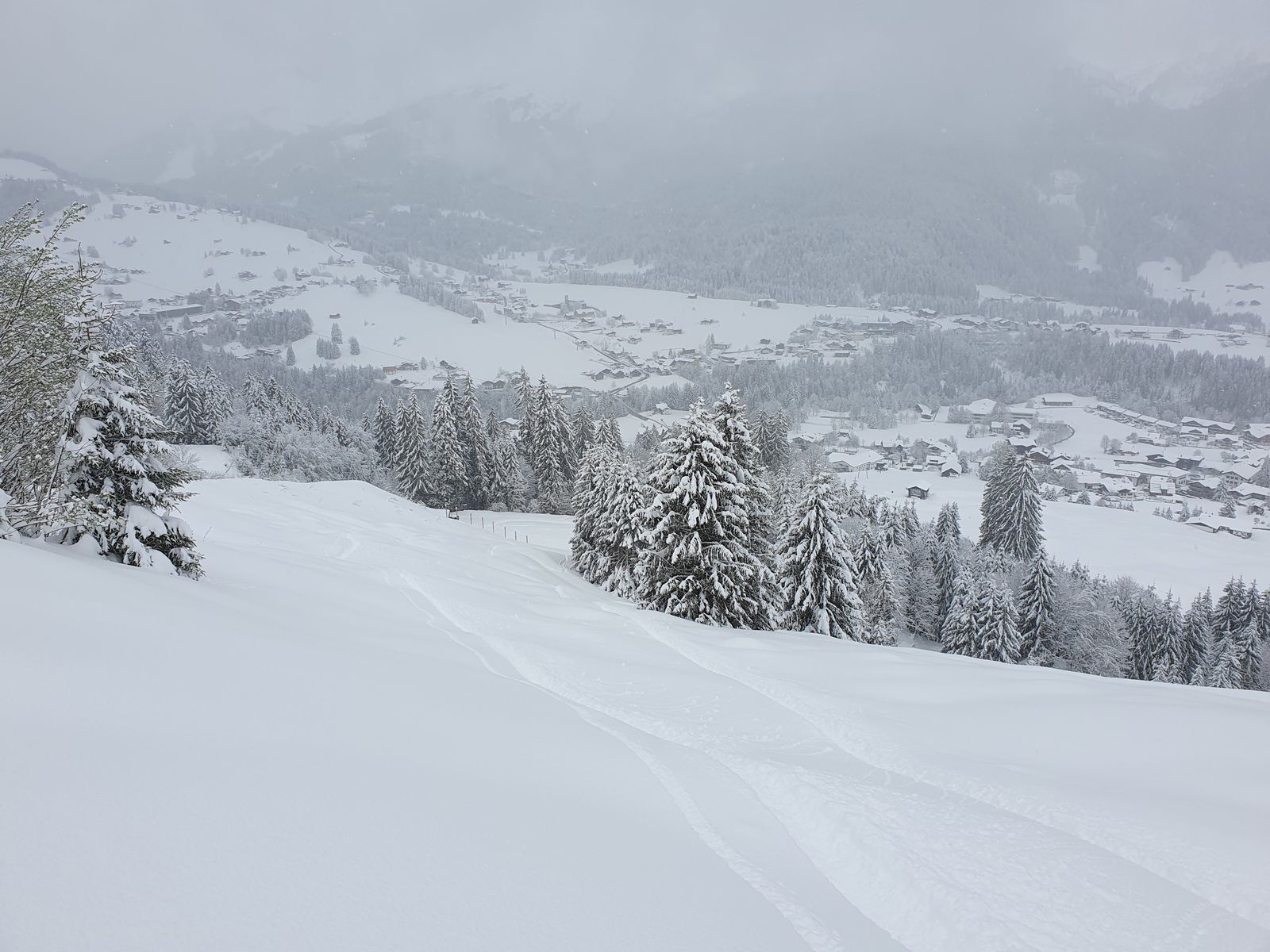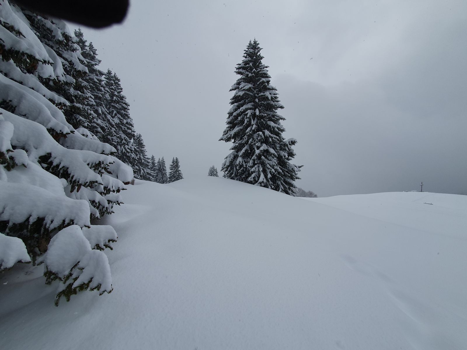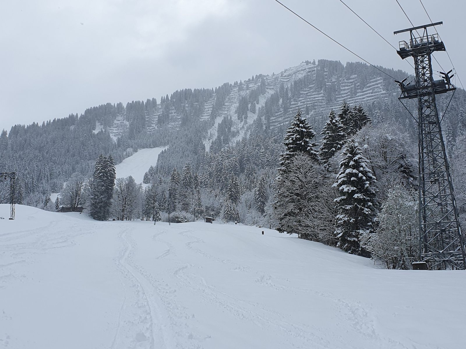 Gestern Ortsausgang Obermaiselstein die Ansage "Schneekettenpflicht", deshalb gestern zuerst Plan B -> Bolsterlang (Dorflift-Wiese grün und leicht weiß gesprenkelt) -> also weiter ins Kleinwalsertal. Dort bei anfangs Null Sicht mein Glück probiert in Riezlern Richtung Kanzelwand + Option ins Fellhorn-Skigebiet.