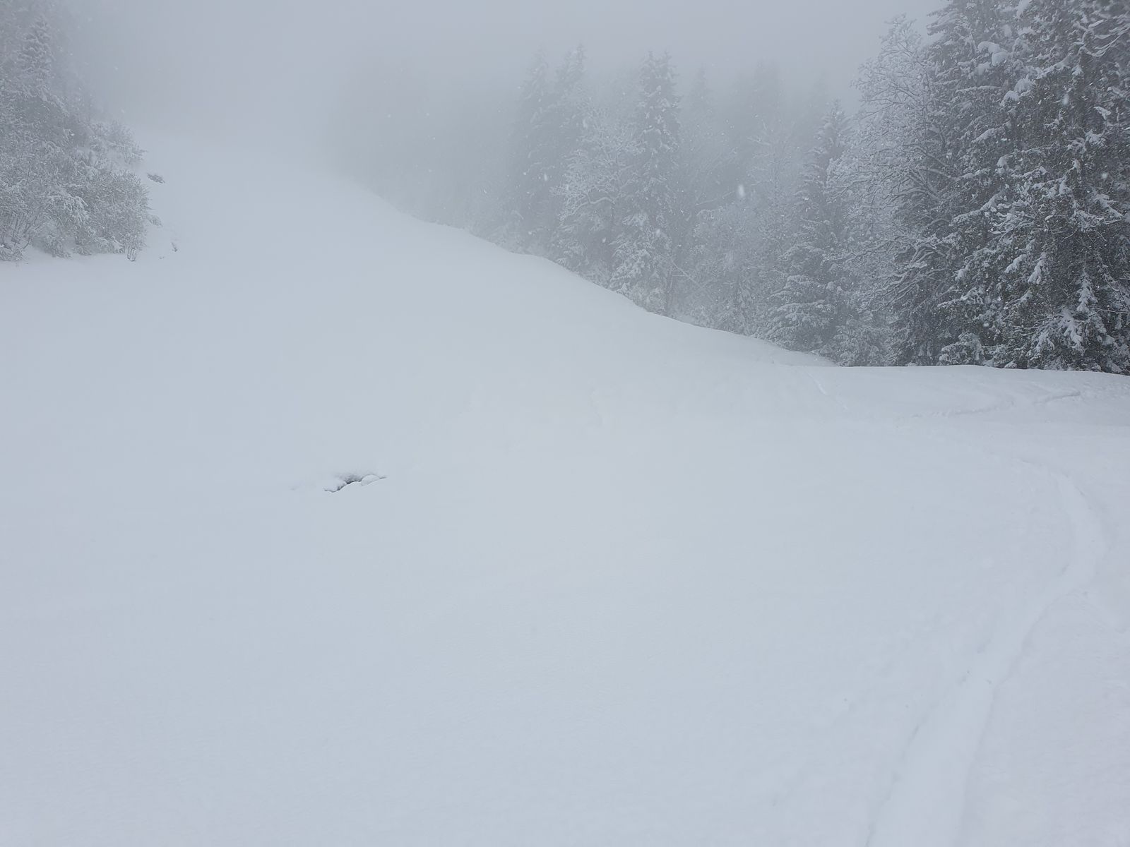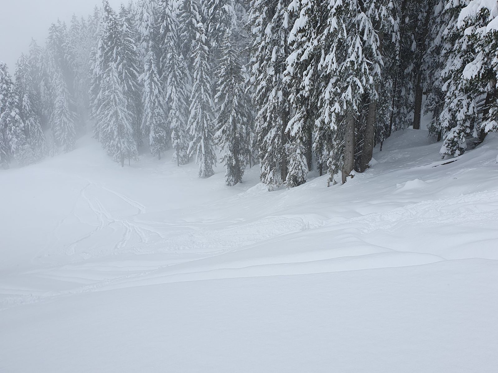 Nachdem ich dort noch nie eine Skitour gemacht habe, habe ich es gleich nach ca. 150 hm geschafft, falsch zu laufen - was aber gut war: ich bin links weg in einen steilen Hang, die Sicht wurde besser und in der Abfahrt Pulver bis zur Hüfte!