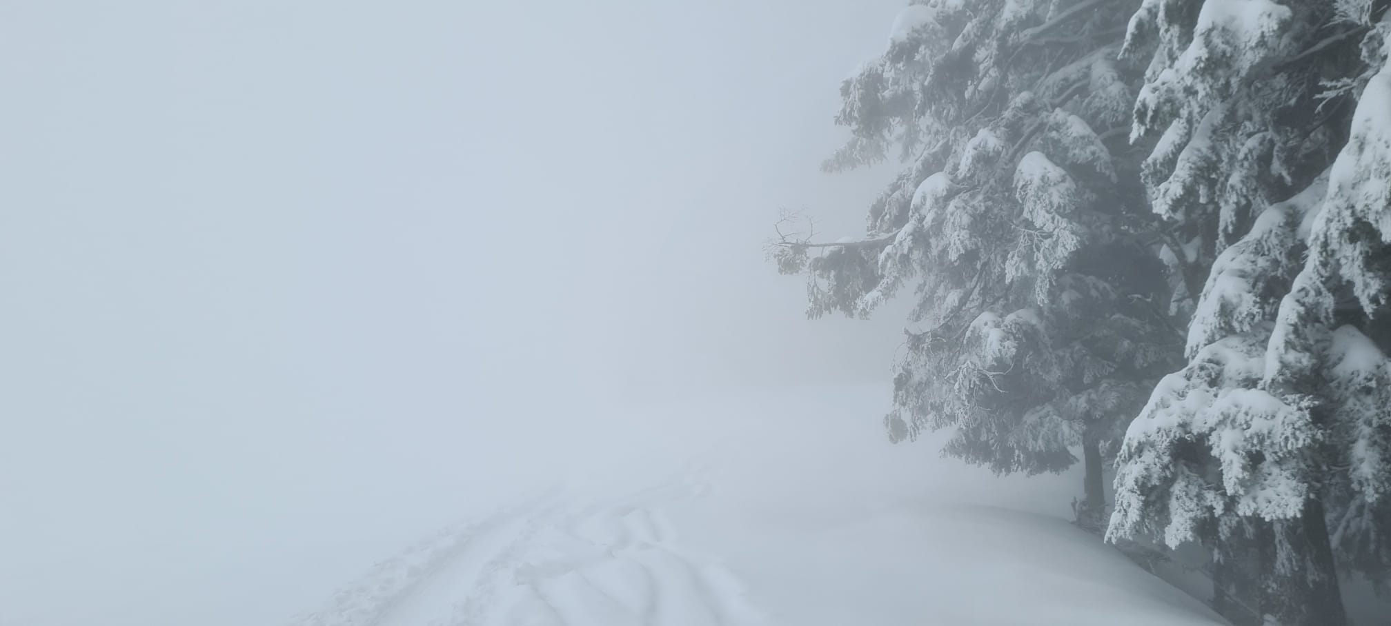 Da alles schon sehr verspurt ist und der Untergrund feucht, war die Abfahrt nicht gerade reines Pulververgnügen, aber auch nicht ganz schlecht. Insbesondere weil es neben WhiteOutPhasen auch gute Sicht gab und dann ist es zum Abfahren gleich etwas feiner. Schneemenge ausreichend, Grundberührung kein Thema. Gestern müssen hier Massen unterwegs gewesen sein, heute vergleichsweise harmlos.